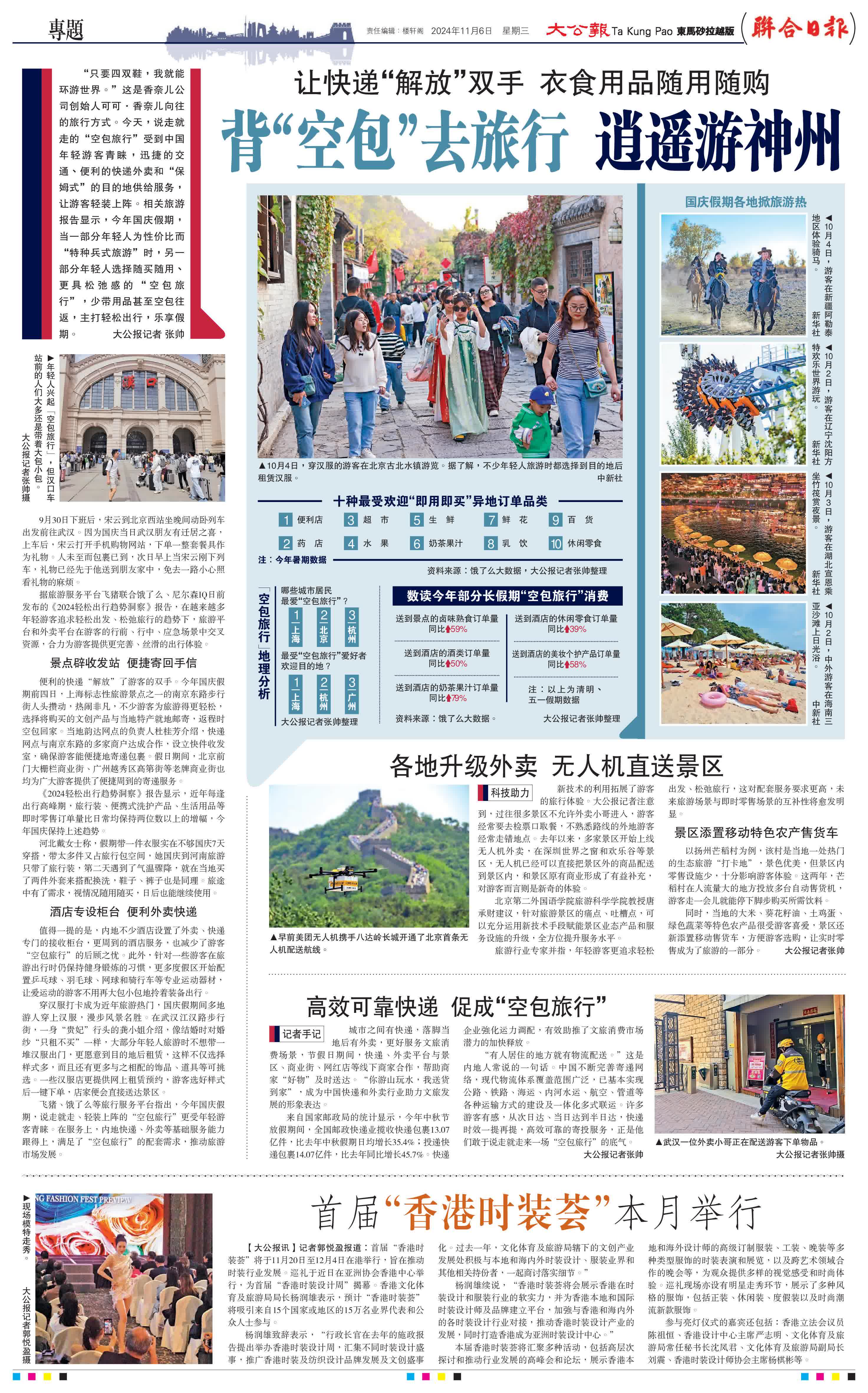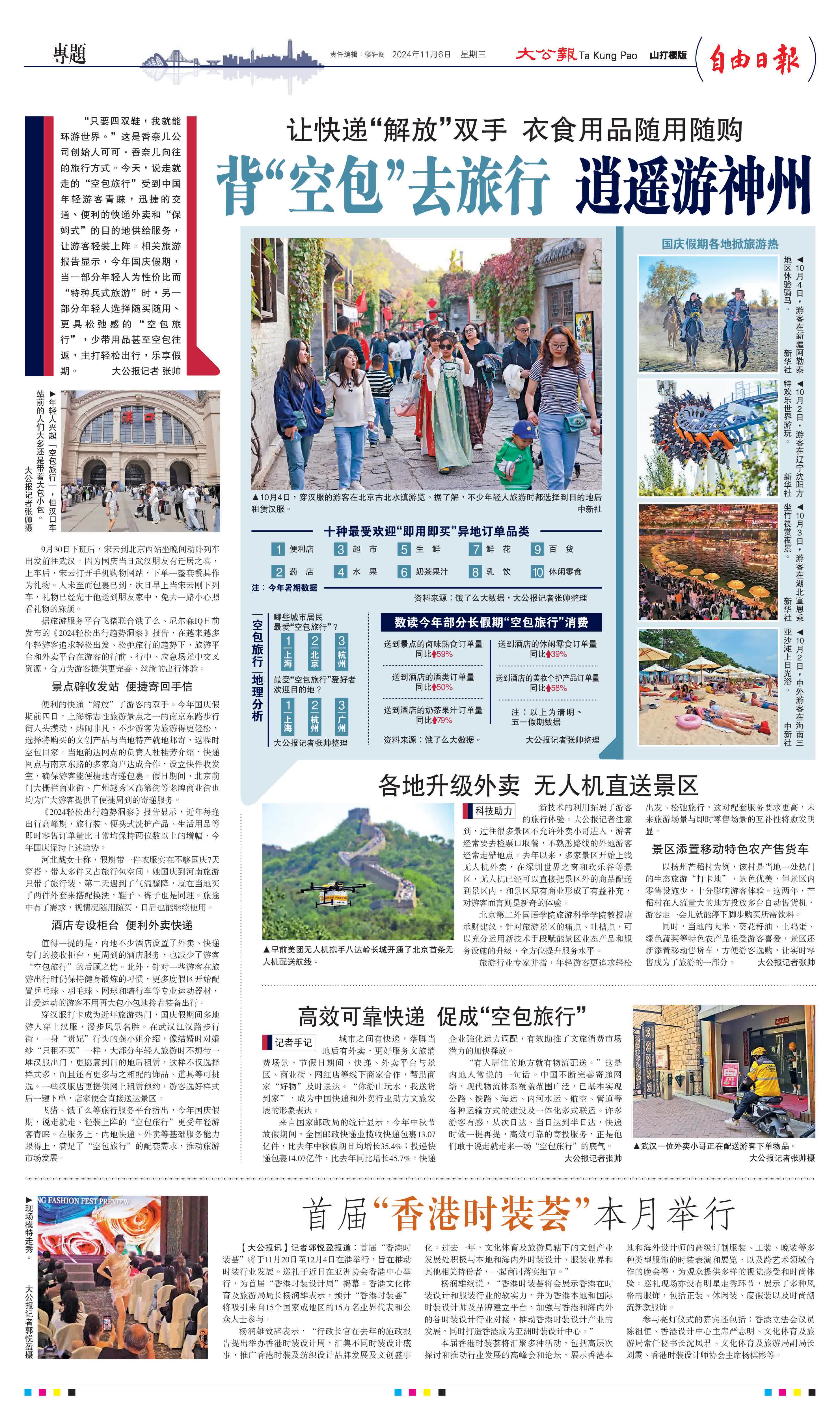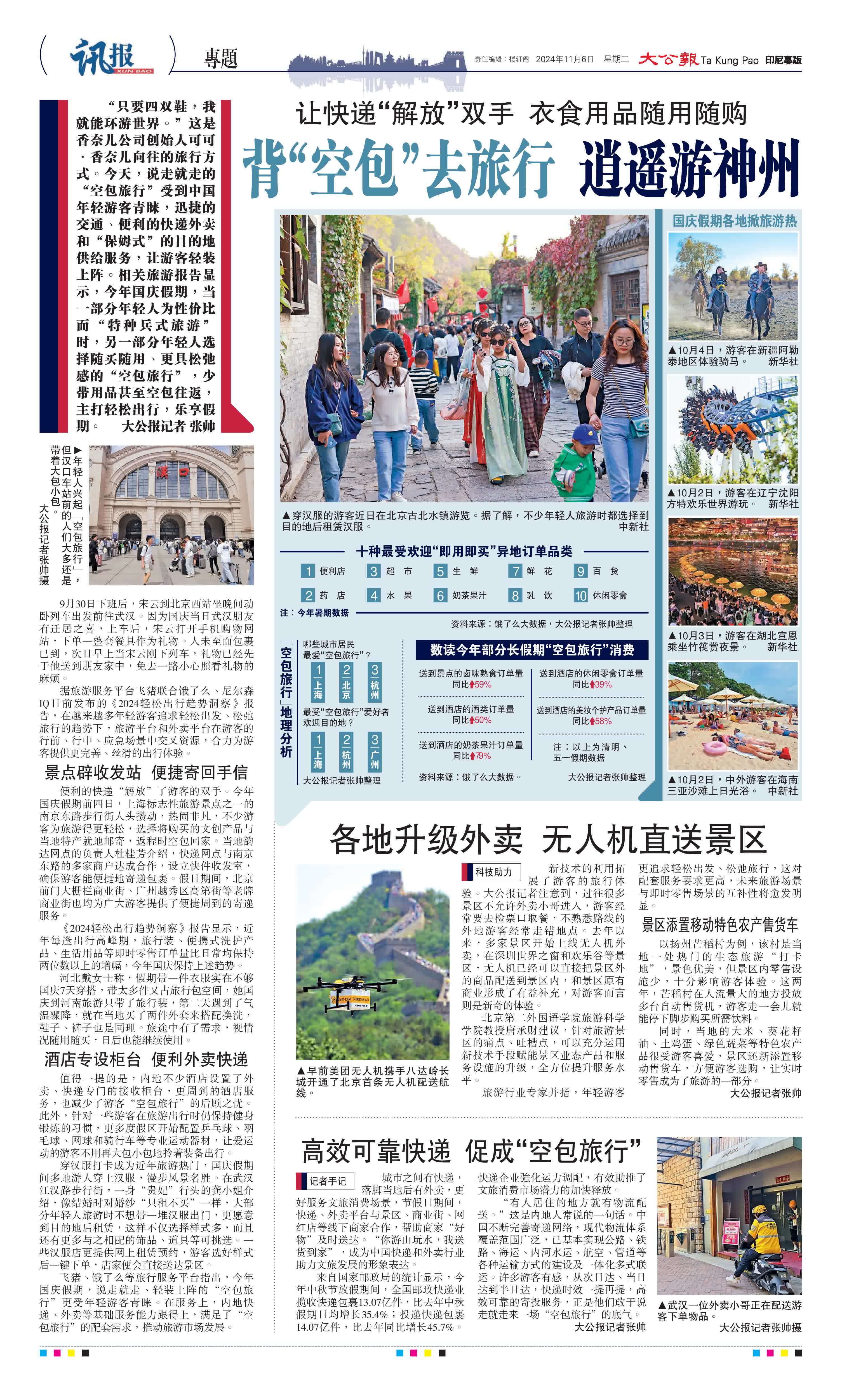 今年國慶假期,當一部分年輕人為性價比而「特種兵式旅遊」時,另一部分年輕人選擇隨買隨用、更具鬆弛感的「空包旅行」,少帶用品甚至空包往返,主打輕鬆出行,樂享假期。11月6日,《京華中原》《聯合日報》《訊報》《自由日報》等多家海外華媒聚焦備受內地年輕遊客青睞的說走就走的「空包旅行」,並對迅捷的交通、便利的快遞外賣和「保姆式」的目的地供給服務讓遊客能夠輕裝上陣等內容進行了關注和報道。