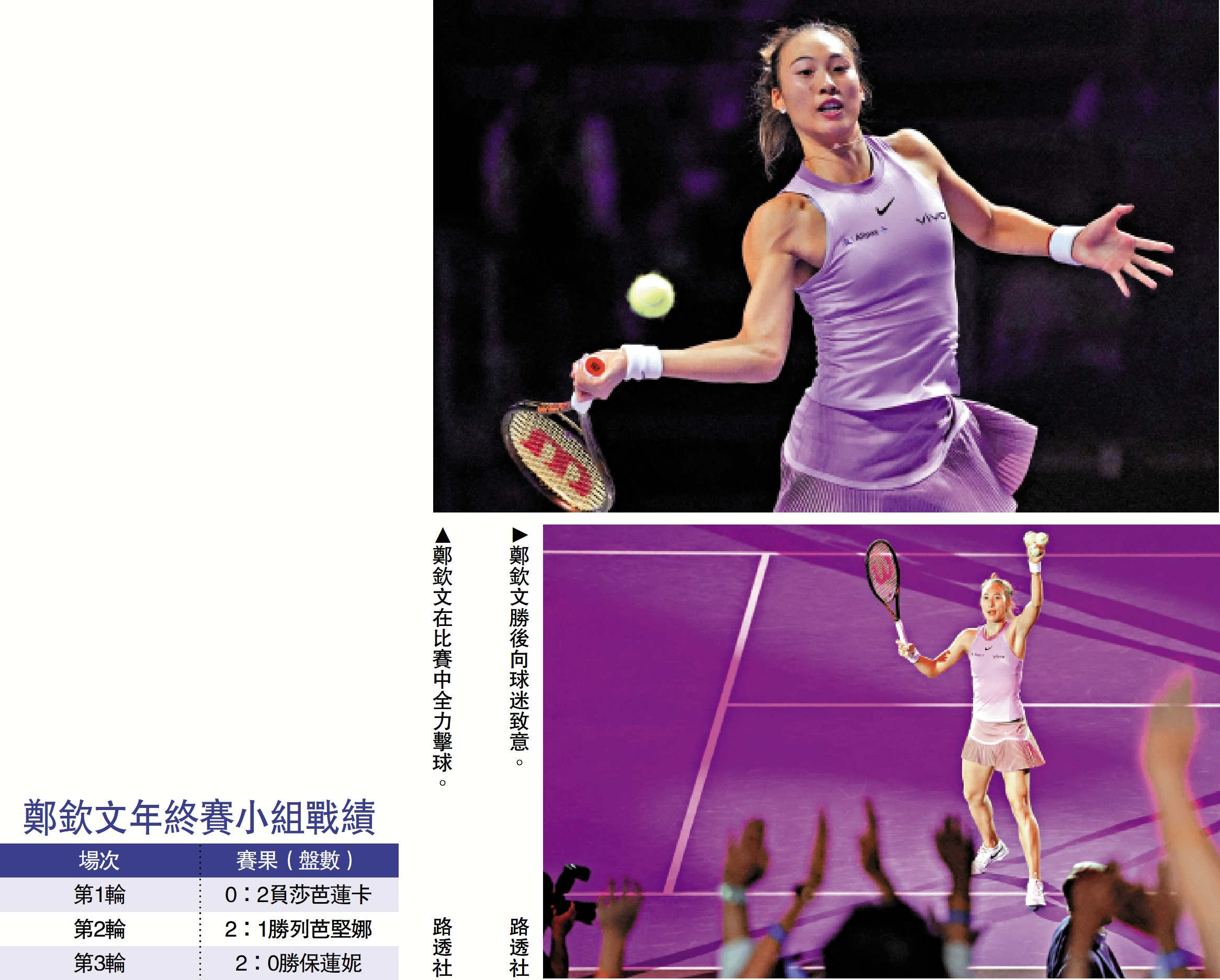 (大公報記者 朱家立)昨晚在沙特阿拉伯首都利雅得舉行的WTA年終總決賽紫組小組賽最後一輪賽事,中國網球名將鄭欽文與意大利球手保蓮妮爭奪出線名額,最終鄭欽文只用了67分鐘便以兩盤6:1輕鬆取勝,順利晉級4強,更取得個人首度亮相總決賽便成功晉級的佳績。