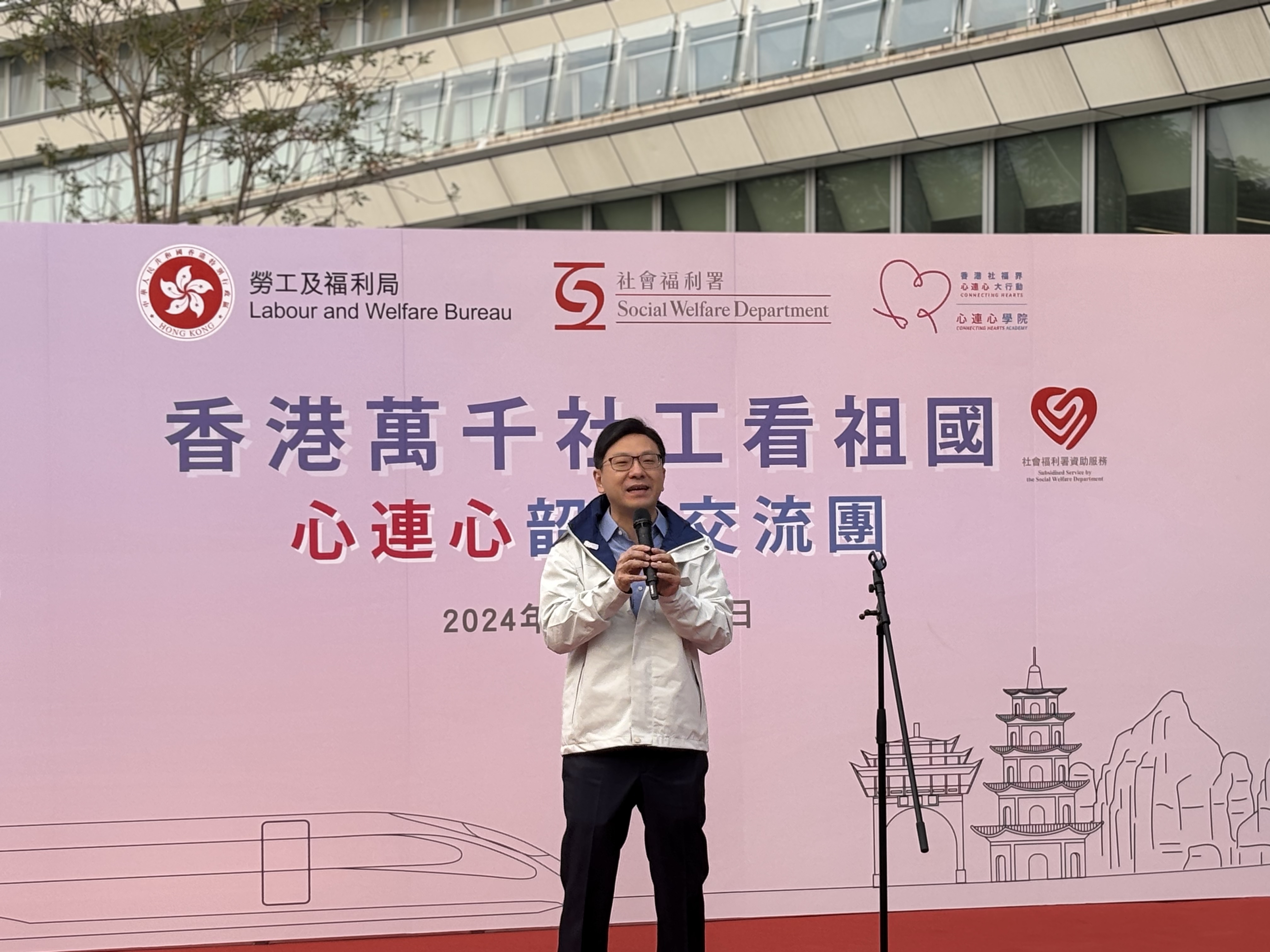 勞工及福利局局長孫玉菡為啟動禮致辭時表示,今次到韶關已是第二次交流團,上次是五月底出發往潮州,帶着微絲細雨,今日則風和日麗,形容是天公作美。他提及,上次300多人出發,包起四分之三輛高鐵;這次再創紀錄,達400多人,實現由心連心交流團包起整輛高鐵。他感謝所有玉成其事的相關單位,事隔五個多月就令此事成真。孫玉菡也希望通過這次韶關交流團,大家能抱着交流心態實地看看國家發展。在養老、育幼、助弱及殘疾復康等方面,國家已大有發展。除業務交流外,希望各位多認識朋友,促進香港與韶關互訪。