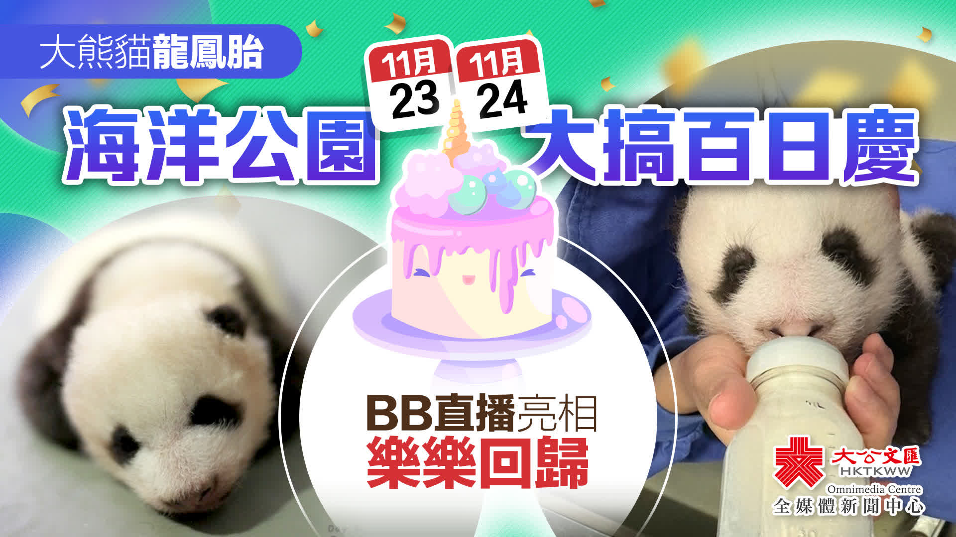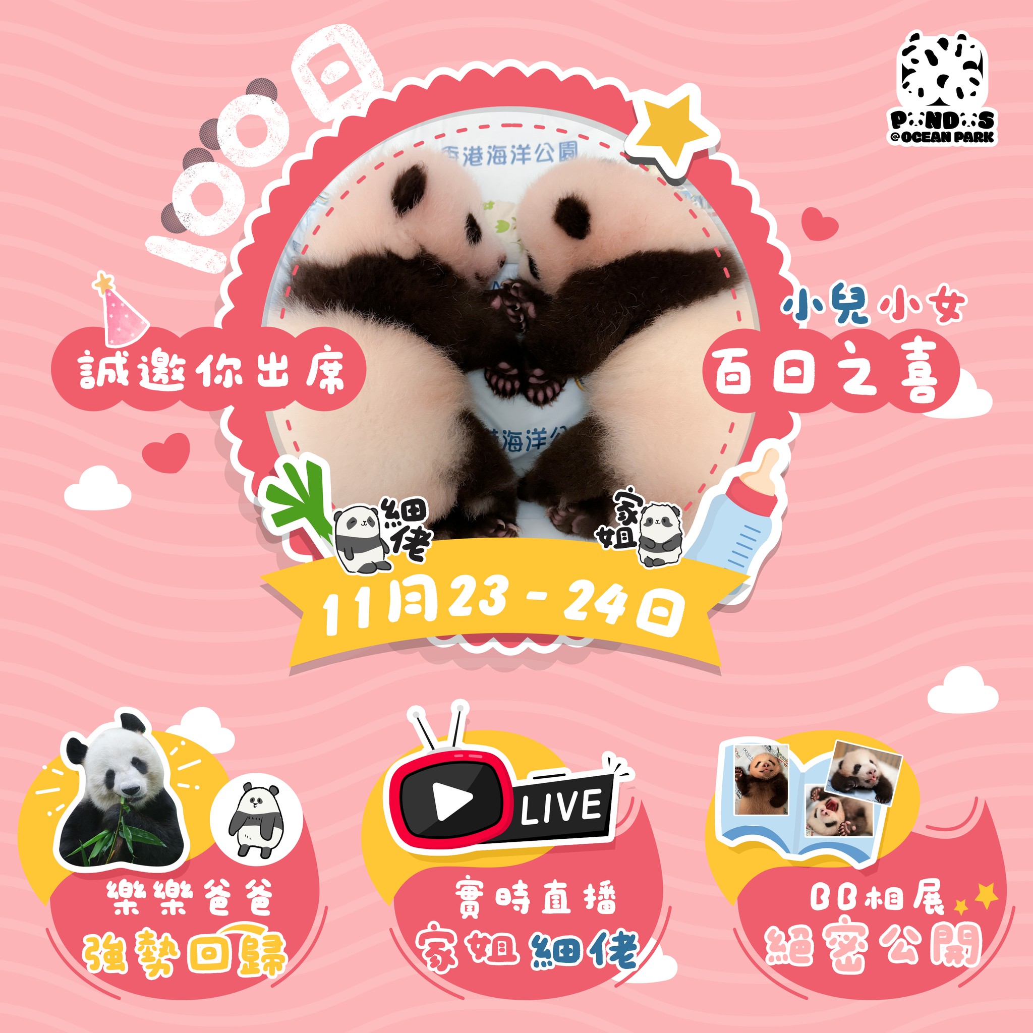 大公文匯全媒體報道,家姐細佬出生要滿百日喇!為了慶祝大熊貓龍鳳胎出生100天,海洋公園宣布將在11月23日至24日全園大搞百日慶,推出一系列大熊貓主題的驚喜活動!