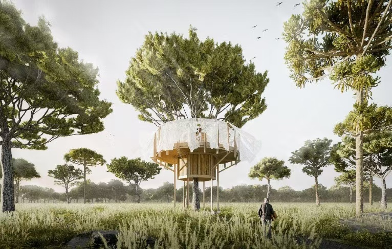 在葡萄牙Alentejo的松樹林的樹屋項目中,張藝凡結合了當地的自然條件,以及瑜伽修鍊背後的哲學理論,通過使用當地的松木,為一對瑜伽愛好者在松樹上搭建了滿足使用者日常修行、生活、會客、布道等需要的樹屋,以佛教六度波羅蜜為出發點,將六度修行分散在樹屋的六邊形空間之中,並有機結合為一體。在實際使用上通過可上下移動的附屬單元,實現了垂直交通便利性,並結合當地炎熱乾燥的氣候,使用輕質材料作為圍護系統,為居住者創造舒適愉悅的生活和修鍊環境。