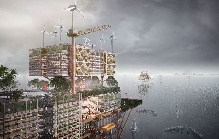 為應對這一挑戰,張藝凡和他的設計團隊創新性地提出了「海上城邦」(Oceanic City-states)的設計概念。這一構想建議利用廢棄的石油鑽井平台建造海上城市,以應對日益緊張的土地資源和居高不下的房價。這些平台將被改造成自給自足的微型社區,每個社區還將承擔一部分城市功能,如市政廳、博物館、圖書館和商場等。