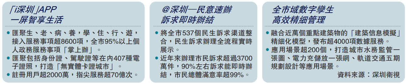 近年,深圳加快培育和發展以數字孿生和人工智能等為引擎的新質生產力,讓城市能感知、會思考、可進化、有溫度,提供主動、精準、智能、高效的服務(詳見表)。