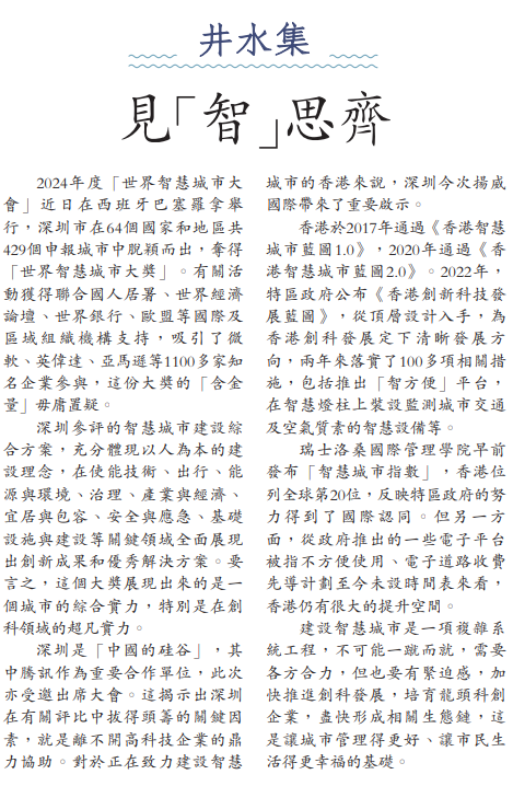 瑞士洛桑國際管理學院早前發布「智慧城市指數」,香港位列全球第20位,反映特區政府的努力得到了國際認同。但另一方面,從政府推出的一些電子平台被指不方便使用、電子道路收費先導計劃至今未設時間表來看,香港仍有很大的提升空間。