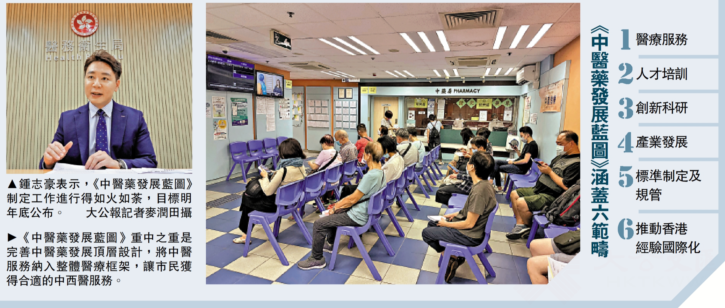 中醫藥發展專員鍾志豪於今年五月上任,負責統籌中醫藥專業及政策發展,與中醫藥界聯繫,共同制定《中醫藥發展藍圖》。他近日接受《大公報》獨家專訪,分享制定《中醫藥發展藍圖》工作最新進展。