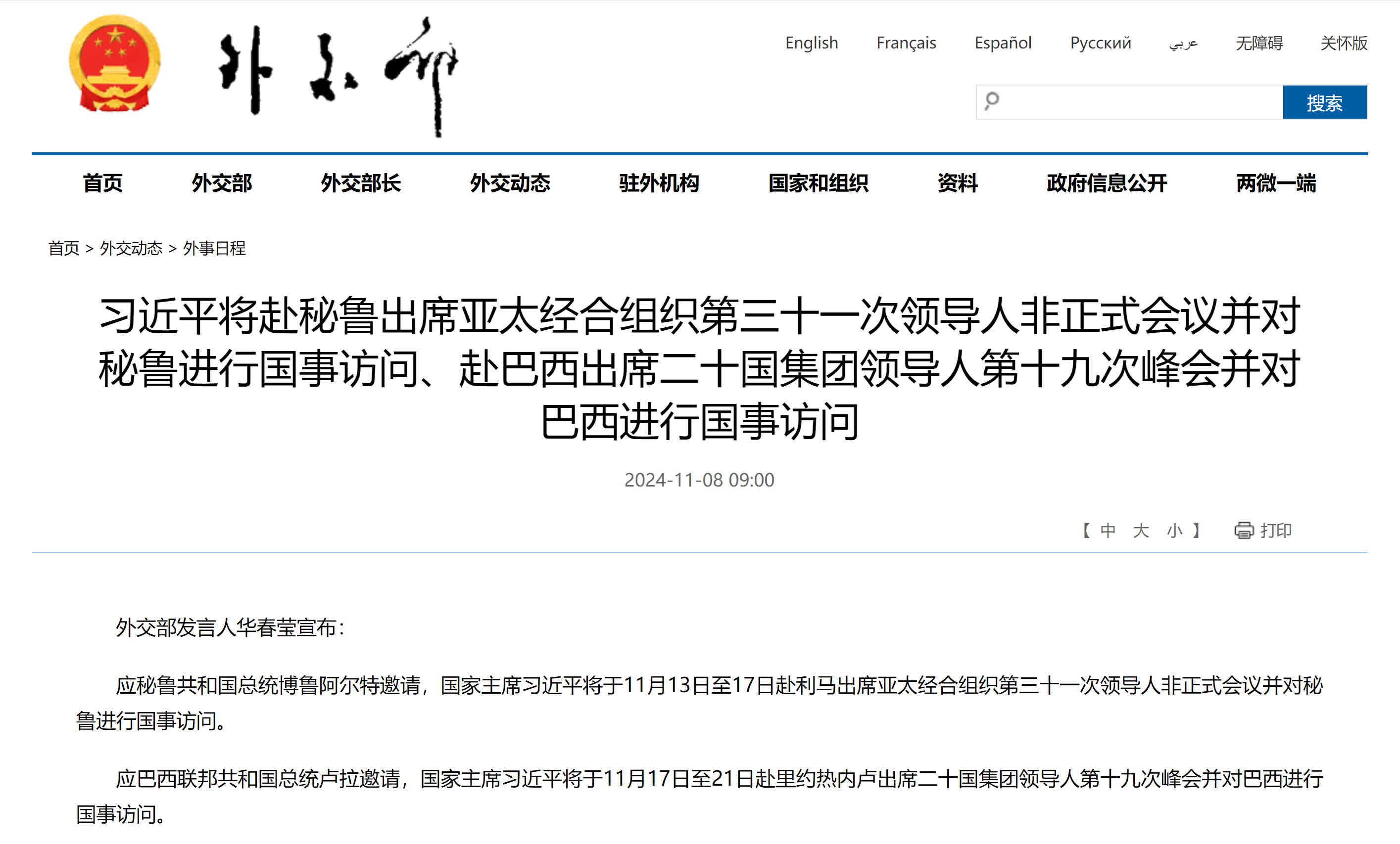 據外交部網站消息,外交部發言人華春瑩8日宣布,應秘魯共和國總統博魯阿爾特邀請,國家主席習近平將於11月13日至17日赴利馬出席亞太經合組織第三十一次領導人非正式會議並對秘魯進行國事訪問。
