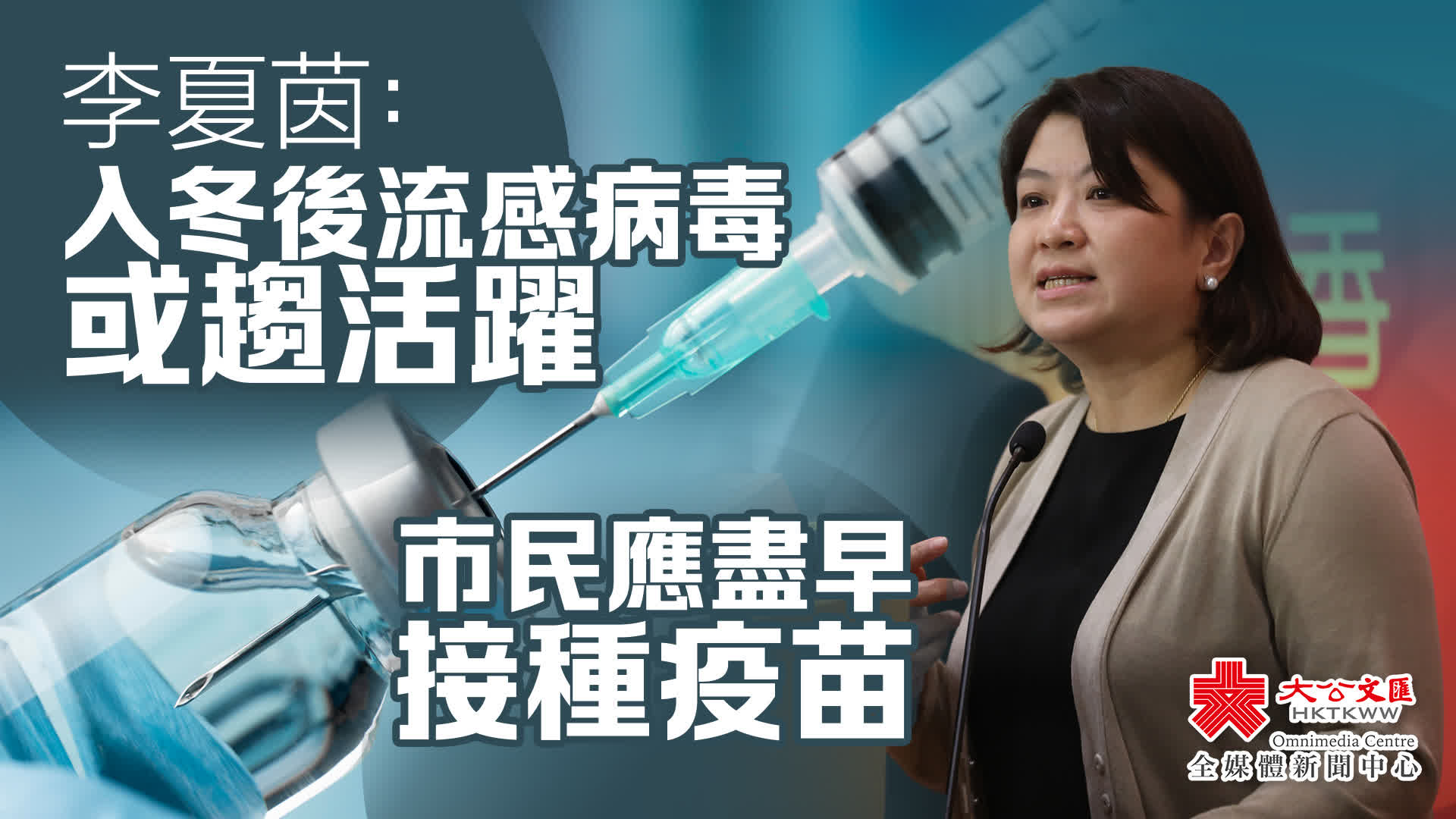 李夏茵再次強烈呼籲廣大市民接種疫苗,「早打唔好遲」,現在接種流感疫苗可在隨後一年有效預防世界衞生組織預測的流感病毒品種,為可能出現的冬季或夏季流感季節一併做好準備。