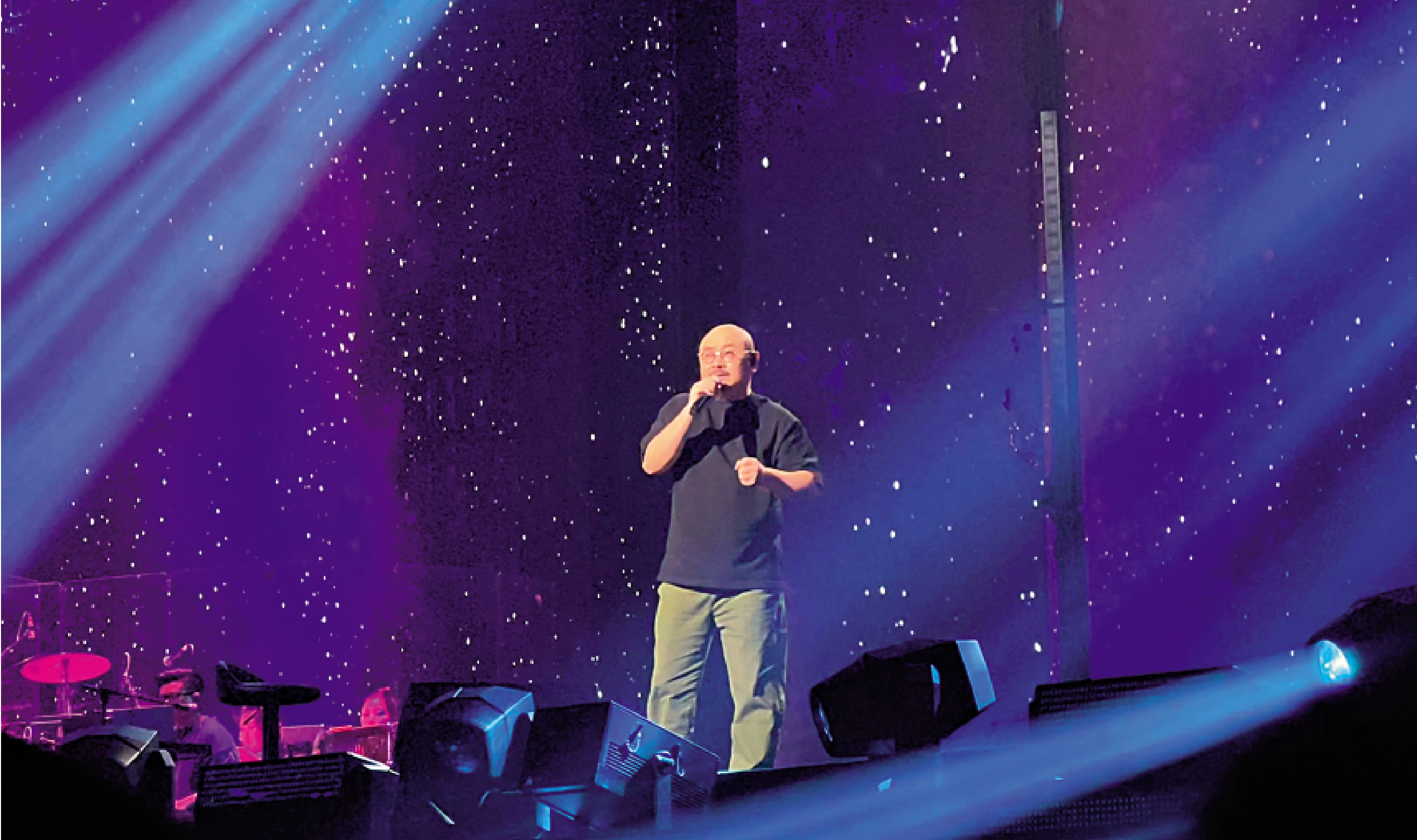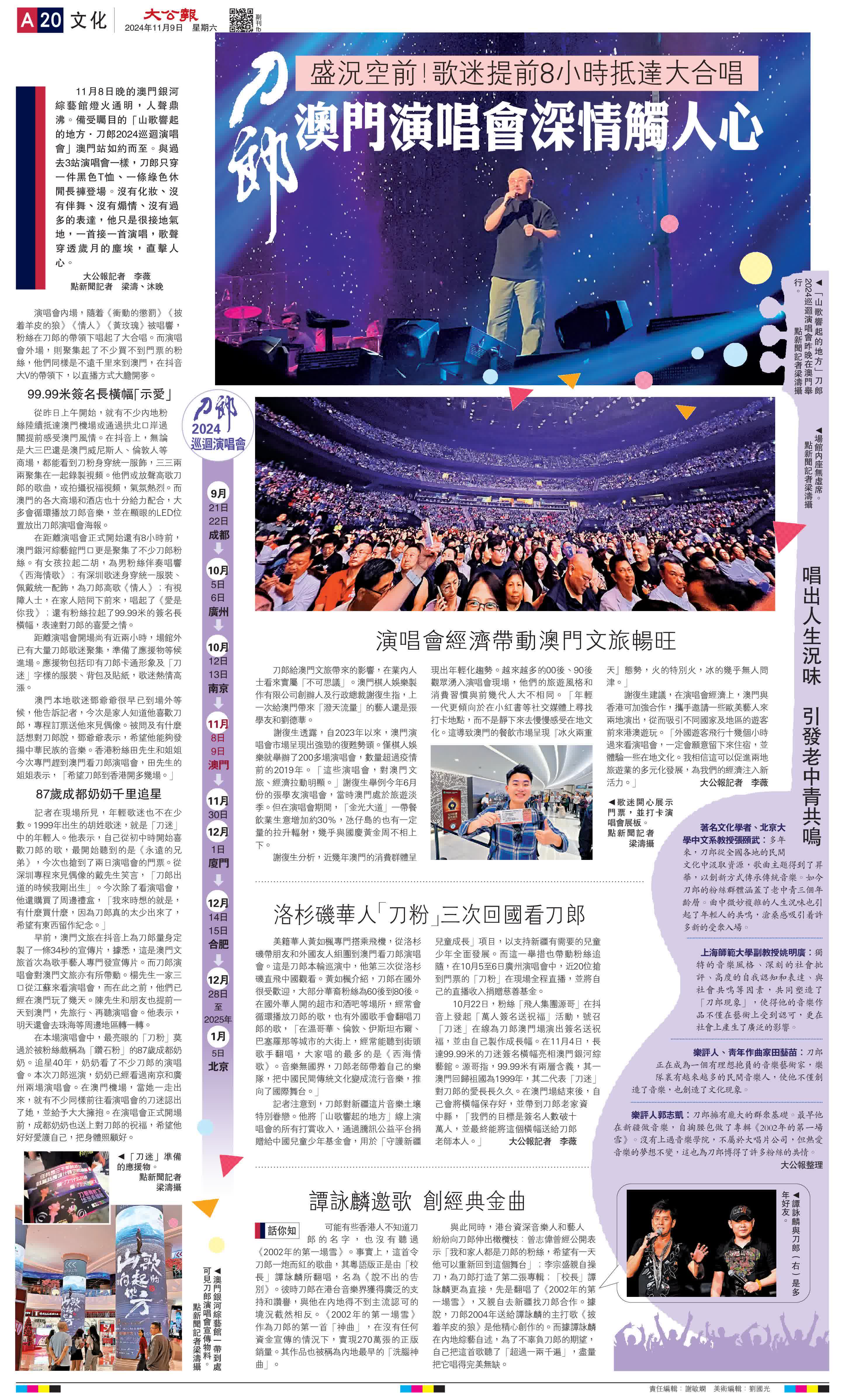 (大公報記者 李薇 點新聞記者 梁濤、沐晚)11月8日晚的澳門銀河綜藝館燈火通明,人聲鼎沸。備受矚目的「山歌響起的地方·刀郎2024巡迴演唱會」澳門站如約而至。與過去3站演唱會一樣,刀郎只穿一件黑色T恤、一條綠色休閒長褲登場。沒有化妝、沒有伴舞、沒有煽情、沒有過多的表達,他只是很接地氣地,一首接一首演唱,歌聲穿透歲月的塵埃,直擊人心。