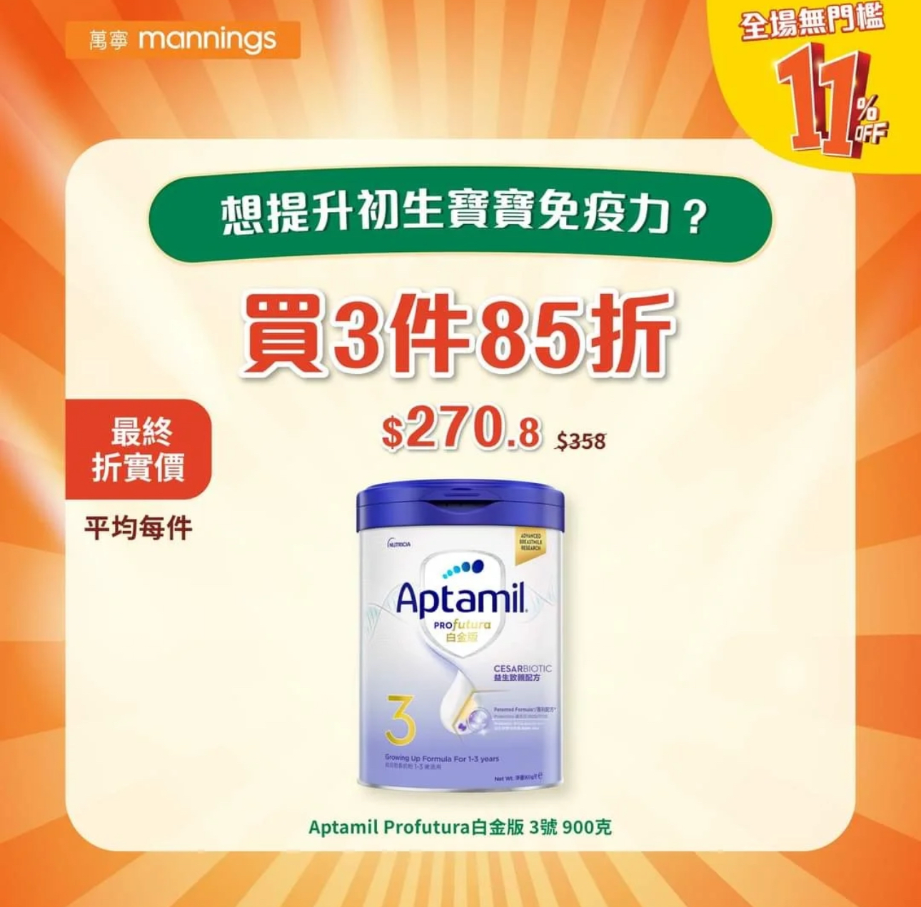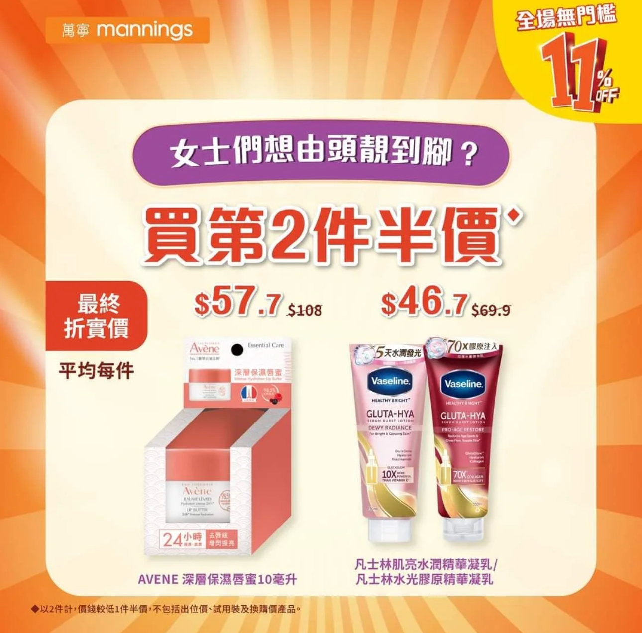 優惠只適用於2024年11月9日,此優惠只適用於香港、澳門萬寧分店及萬寧官網。今日更可享受「折上折」優惠活動,即全場指定產品優惠價格再享89折優惠。