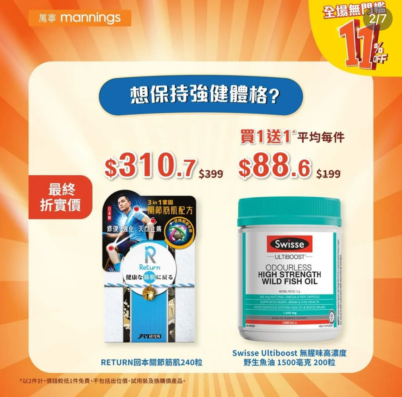 優惠不適用於購買萬寧禮劵、初生配方嬰兒奶粉、處方藥物、出位價產品及換購價產品、無折扣貨品、會員積分及印花活動換購品、塑膠購物袋徵費、易辦事Easy Cash提款及八達通增值服務及每張訂單之運費。此優惠不可與enJoy Day、萬寧現金優惠劵、消費劵優惠劵、銀聯優惠及其他優惠同時使用。