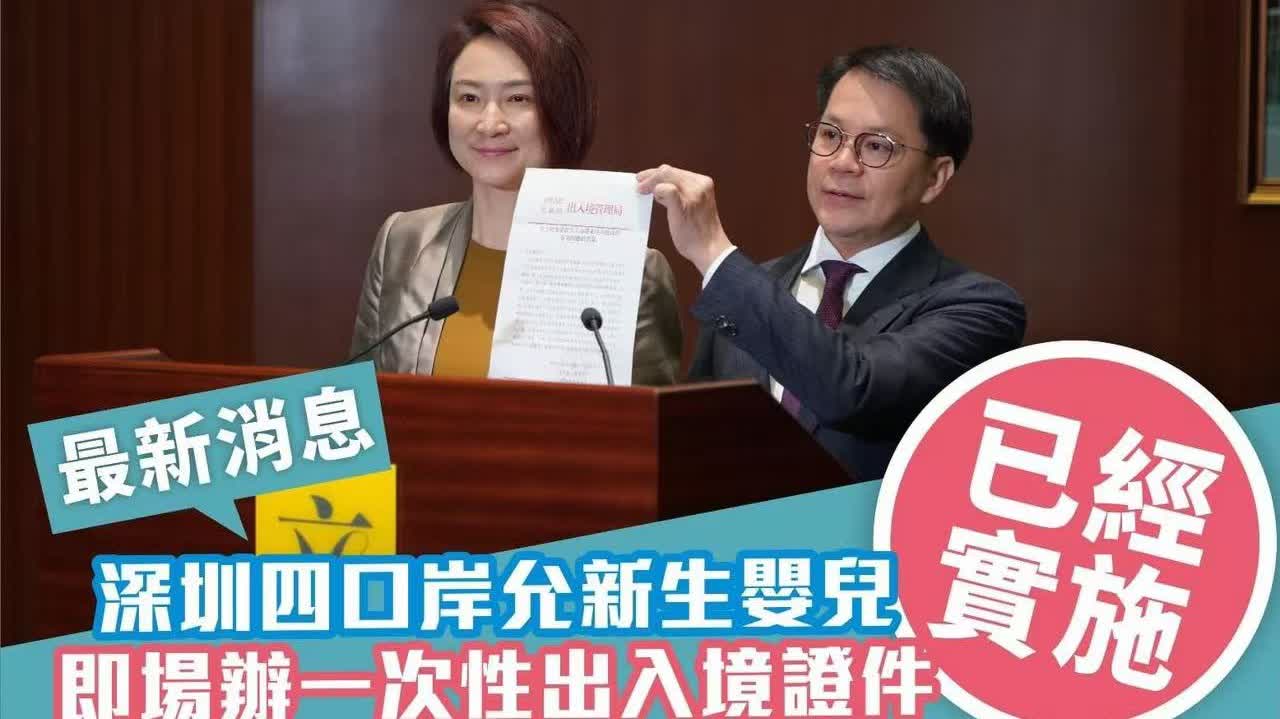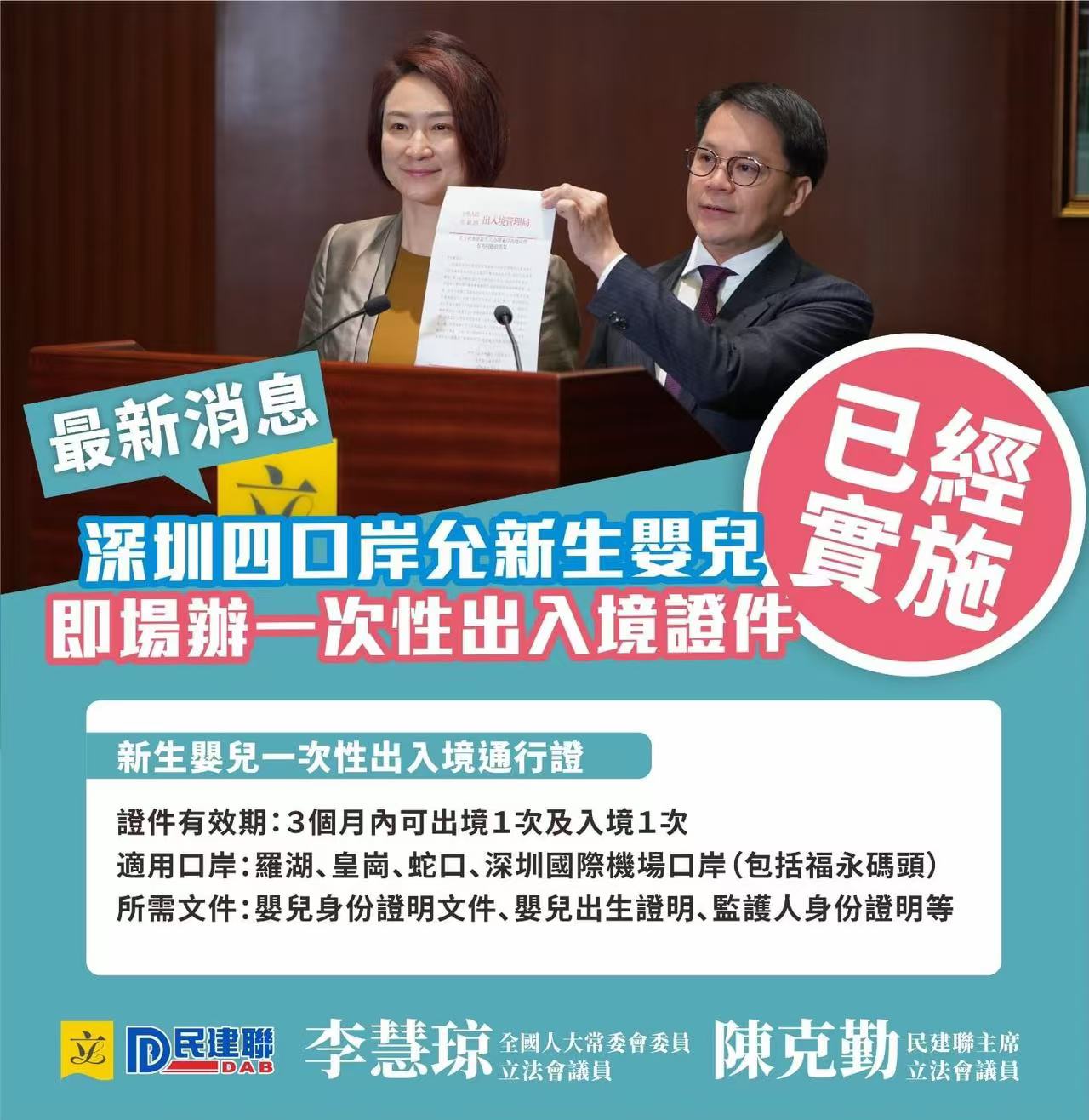 大公文匯全媒體報道,民建聯主席陳克勤日前在社交平台發布最新消息,內地出入境部門已批准,11月7日起在深圳4個指定口岸,即羅湖、皇崗、蛇口和深圳國際機場(包括福永碼頭),可即場申領新生嬰兒一次性出入境證件,有效期三個月。