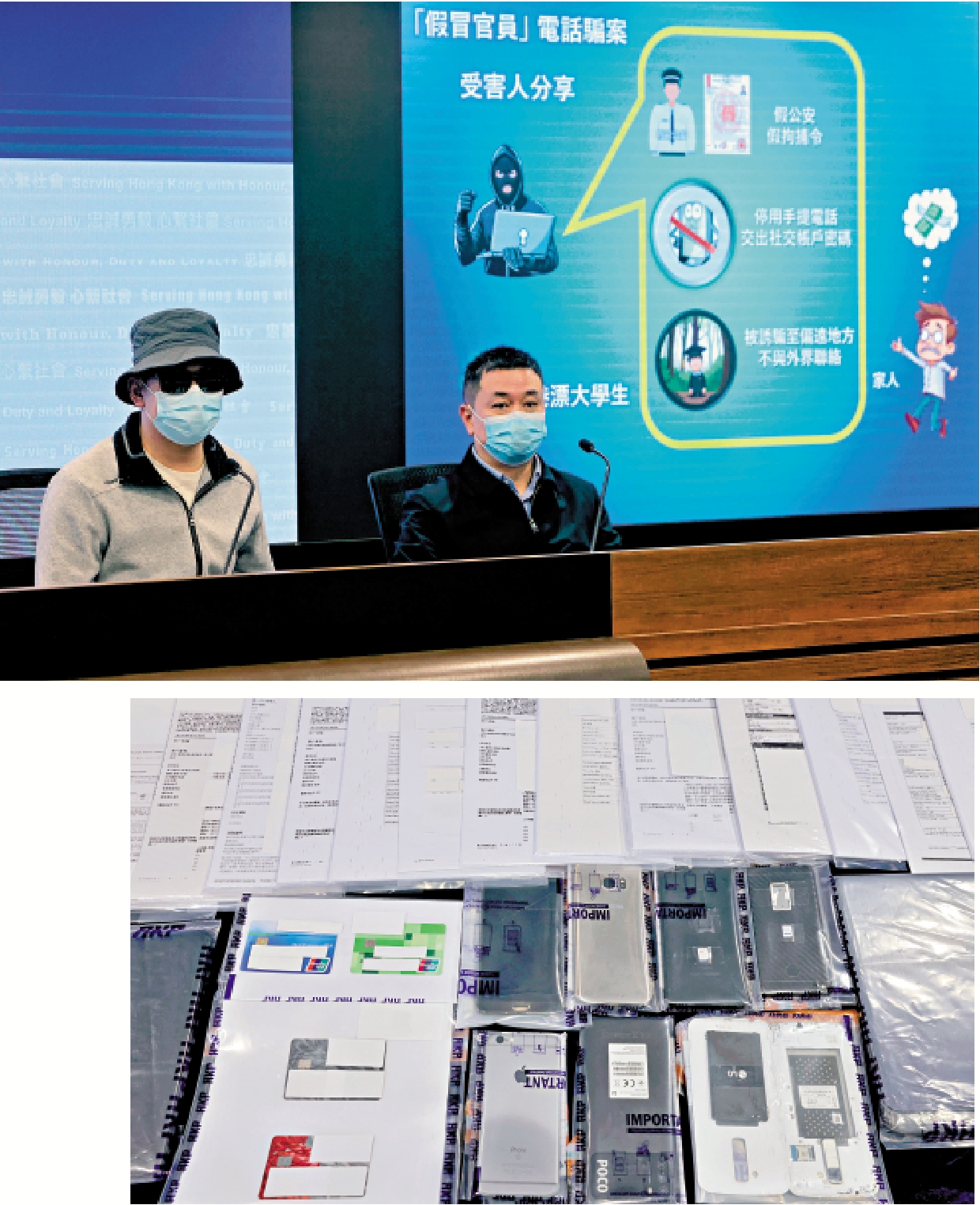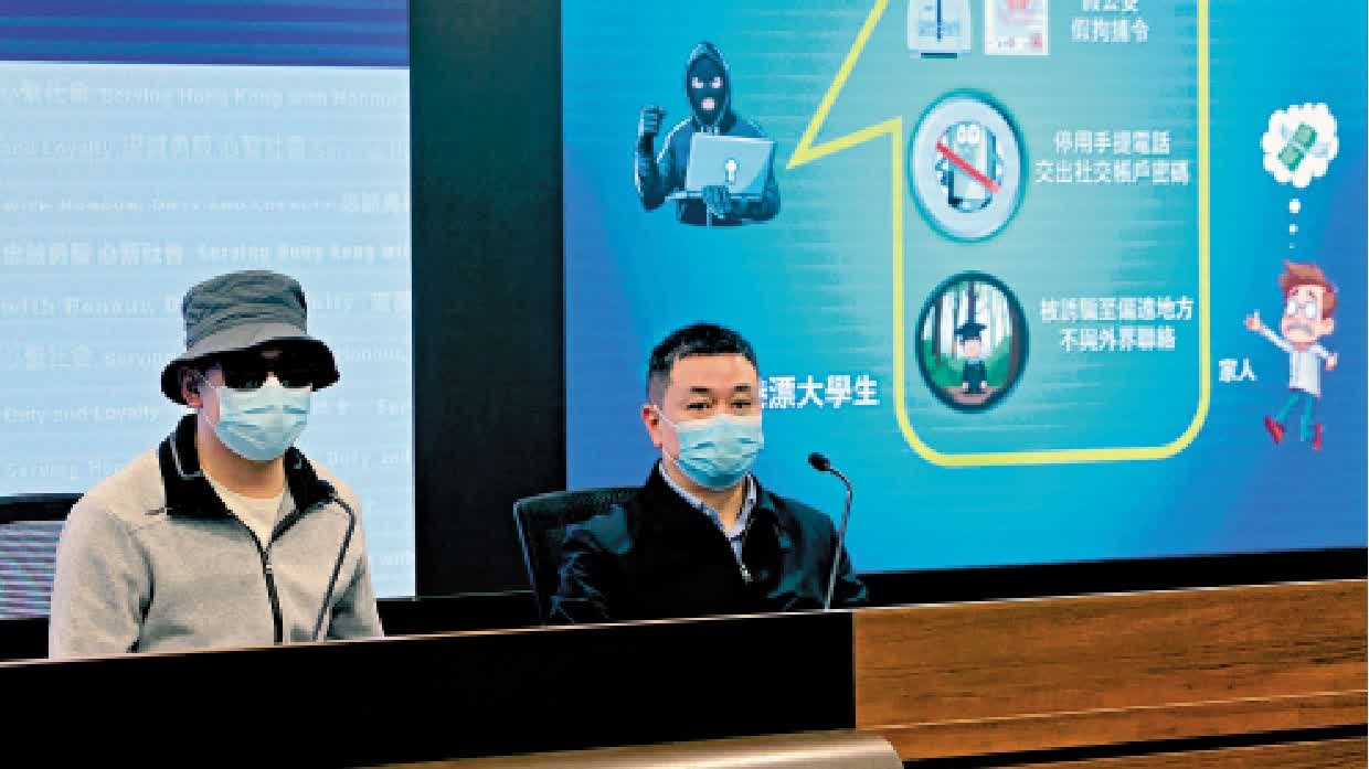 18歲從內地來港就讀的大一學生阿聰(化名)在上月初收到自稱東莞公安的視像通話,聲稱他涉及一宗刑事案件,他已被限制出入境香港,要求他每日透過電話向他們報到及跟隨指示以自證清白。阿聰當時見到對方自製的所謂拘捕令及起訴書,以及身穿公安制服,便信以為真,騙徒要求他轉移至不同賓館匿藏,以及拍攝被禁錮相片和求饒視頻作「查案」用途,更勒令他交出微信的賬號與密碼以保障自身安全,並斷絕與外界的通訊,亦不可將事情告訴親友。其間雖然有室友提醒他這可能是騙徒陷阱,但由於對方一直無要求他支付任何金錢,阿聰對騙徒的威嚇深信不疑,打消了室友的關心而錯失脫險良機。
