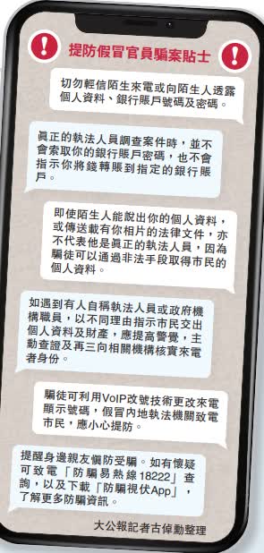 (大公報記者 古倬勳<文> 古倬勳、張凱文<視頻>)港島總區在今年9月開學至今,共接獲55宗涉及假冒官員詐騙內地生的案件,損失金額達3900萬元,最大一宗更高達350萬。騙徒手法層出不窮,針對「港漂」人生路不熟的心理弱點,甚至不惜偽造所謂拘捕令、制服等道具,令對方墮入陷阱。