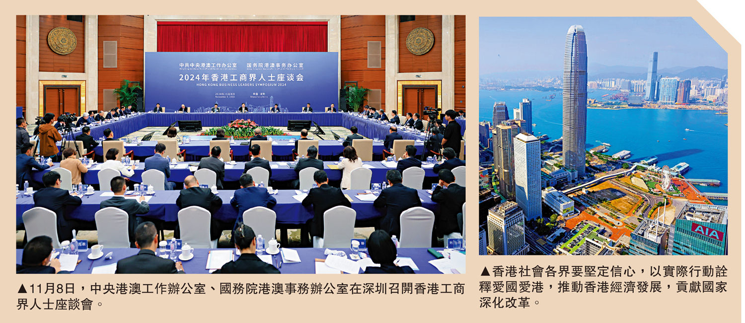 (大公報記者 吳俊宏)11月8日,中央港澳工作辦公室、國務院港澳事務辦公室在深圳召開2024年香港工商界人士座談會。中央港澳工作辦公室、國務院港澳事務辦公室主任夏寶龍在會上表示,當前香港內外環境發生深刻變化,大家要深入學習貫徹習近平主席給祖籍寧波的香港企業家重要回信精神,正確認識自身發展與香港發展、國家發展的關係,堅定對香港和國家發展的信心,主動識變應變求變,充分發揮「一國兩制」制度優勢,以實際行動詮釋愛國愛港,以港為家,倚港興業,共同建設美好香港,在強國建設、民族復興偉業中更好發揮作用。