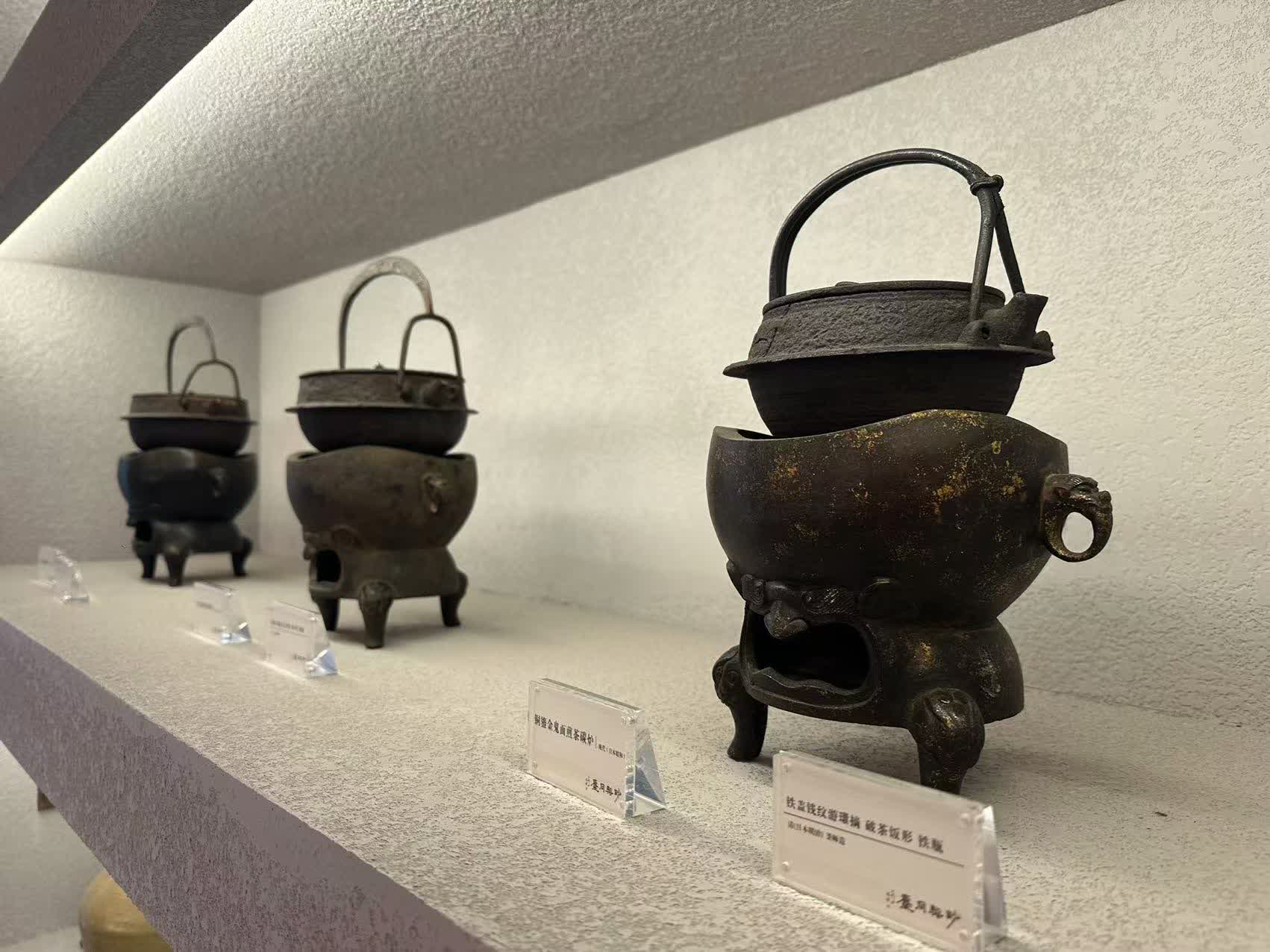 走進藍堂,一股濃郁的文化氣息撲面而來。一層展區分為兩部分,外側展示着晚清至民國時期的茶具,如渣鬥建水、鐵瓶銀瓶、碳爐火缽等;裏側則陳列着明代至近代的古代字畫及文房用品。這兩部分展品交相輝映,讓參觀者彷彿穿越時空,感受中國茶具文化的演變與傳承。