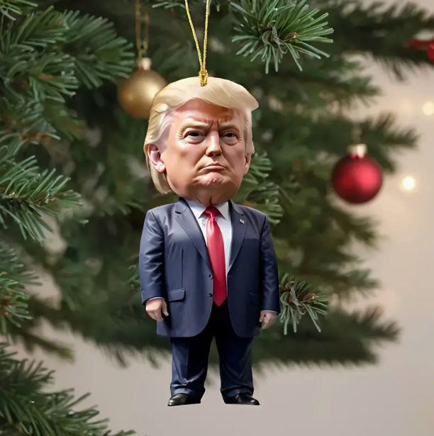 聖誕將近,不少商家乘機結合熱度,把特朗普的人物形象做成聖誕掛飾。不僅有他身着西裝的經典站立形象,還有根據特朗普在賓州巴特勒市舉行的競選集會現場遇刺而被捕捉到的經典照片設計的掛件。