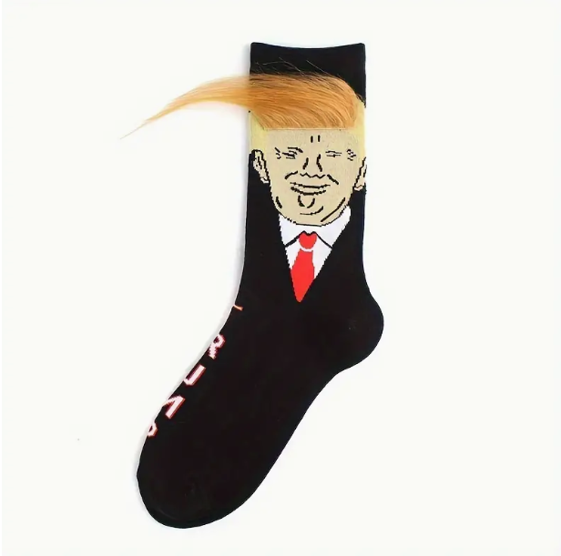 有設計者惡搞特朗普的一頭金髮,以此為靈感將其設計在了襪子上。可以看出,特朗普的金髮確實異常「飄逸又蓬鬆」,在襪子上也如此「栩栩如生」。不知道這個襪子能不能用來裝聖誕禮物呢?