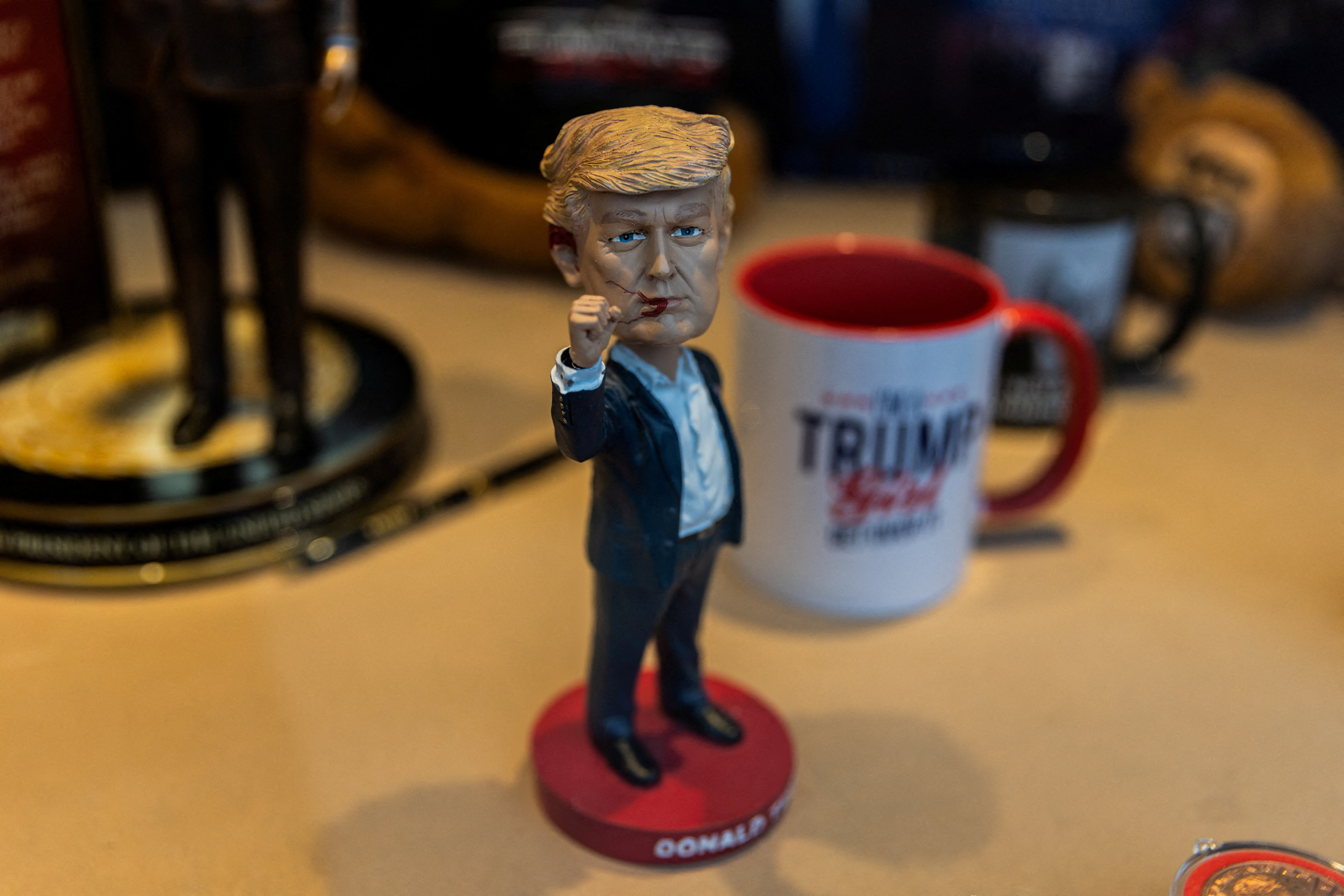 有設計者以特朗普為原型,設計了不同的公仔擺件。例如以特朗普遇刺為靈感的擺件,個性十足。