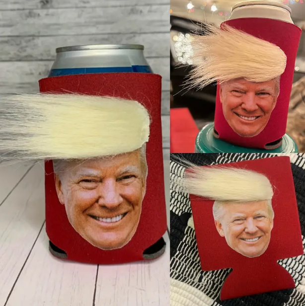 同樣以特朗普的金髮為設計靈感的還有一款保溫杯套。與襪子的卡通形象相比,該款保溫杯套更是直接將特朗普的照片印在了杯套上,又以立體的金色材質突出了特朗普的飄逸金髮,似乎真的可以用梳子為他整理頭髮?