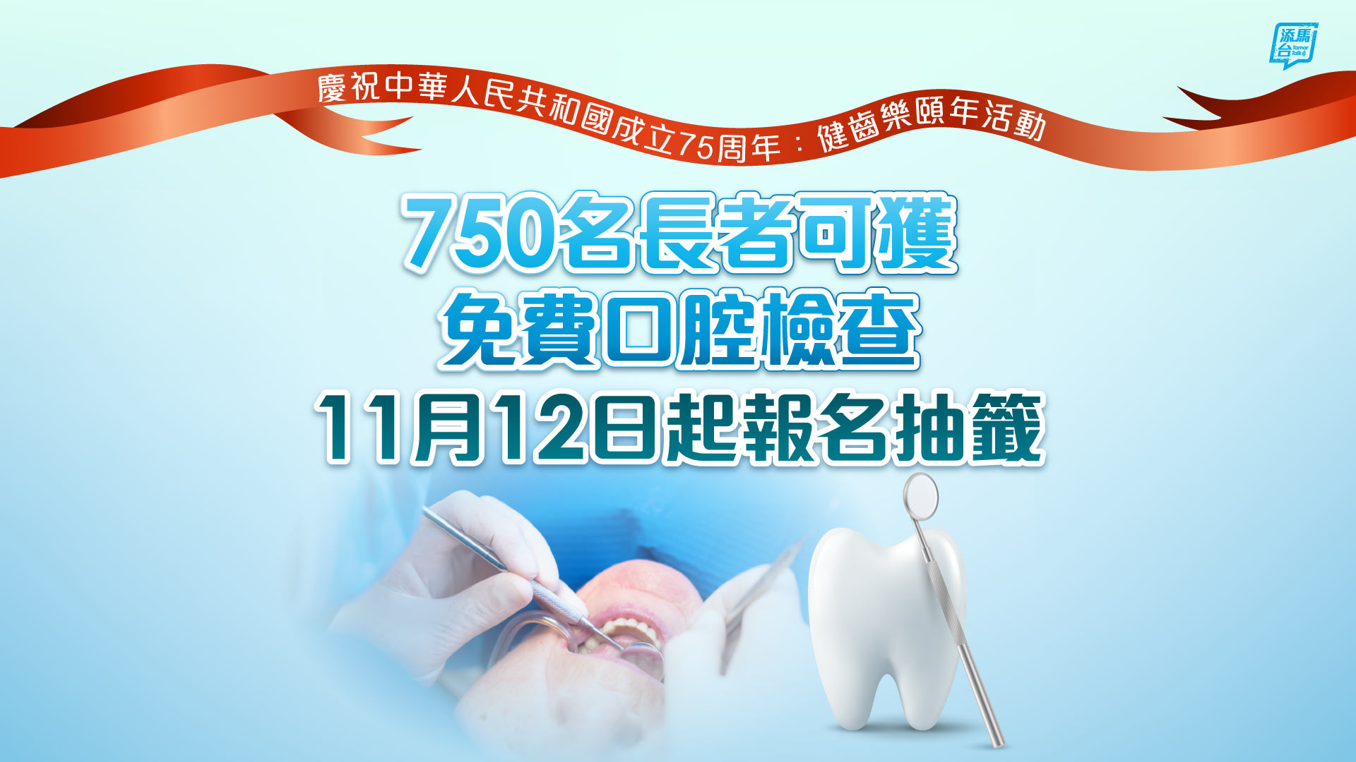「慶祝中華人民共和國成立七十五周年──香港牙醫學會健齒樂頤年活動」將於12月至明年3月期間,為750名長者提供免費口腔檢查,名額會以抽籤形式分配。