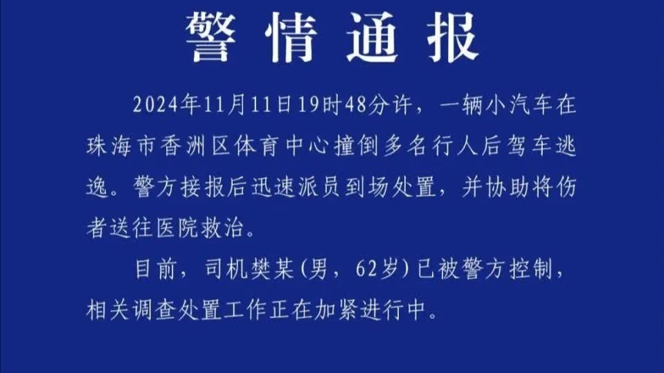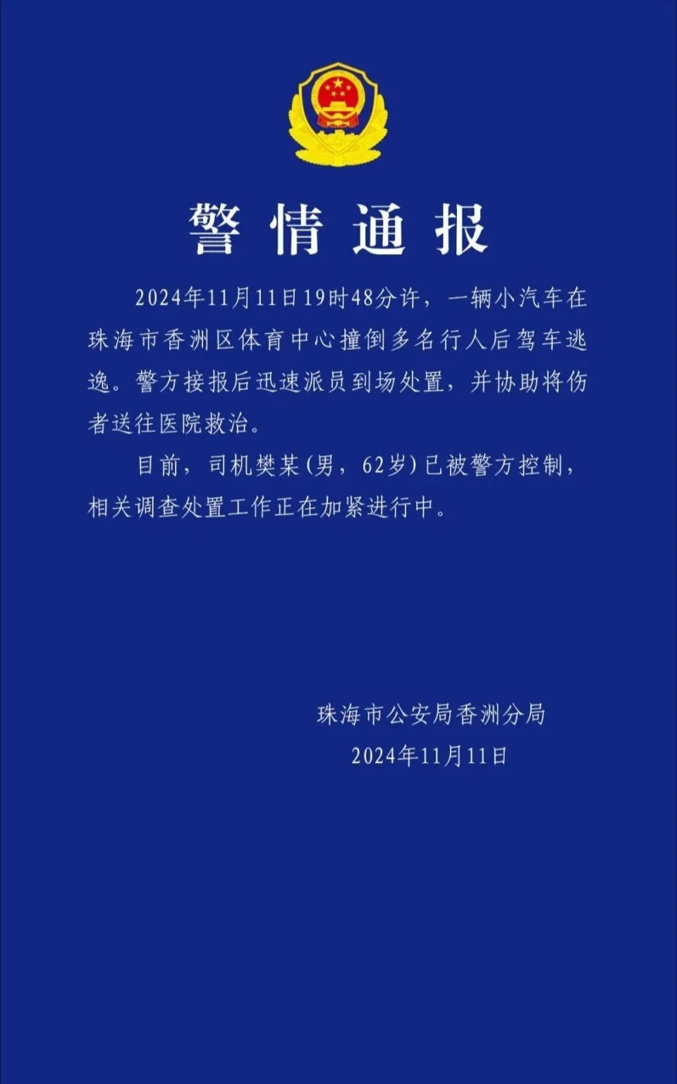珠海市公安局香洲分局其後通報指,2024年11月11日19時48分許,一輛小汽車在珠海市香洲區體育中心撞倒多名行人後駕車逃逸。警方接報後迅速派員到場處置,並協助將傷者送往醫院救治。目前,司機樊某(男,62歲)已被警方控制,相關調查處置工作正在加緊進行中。