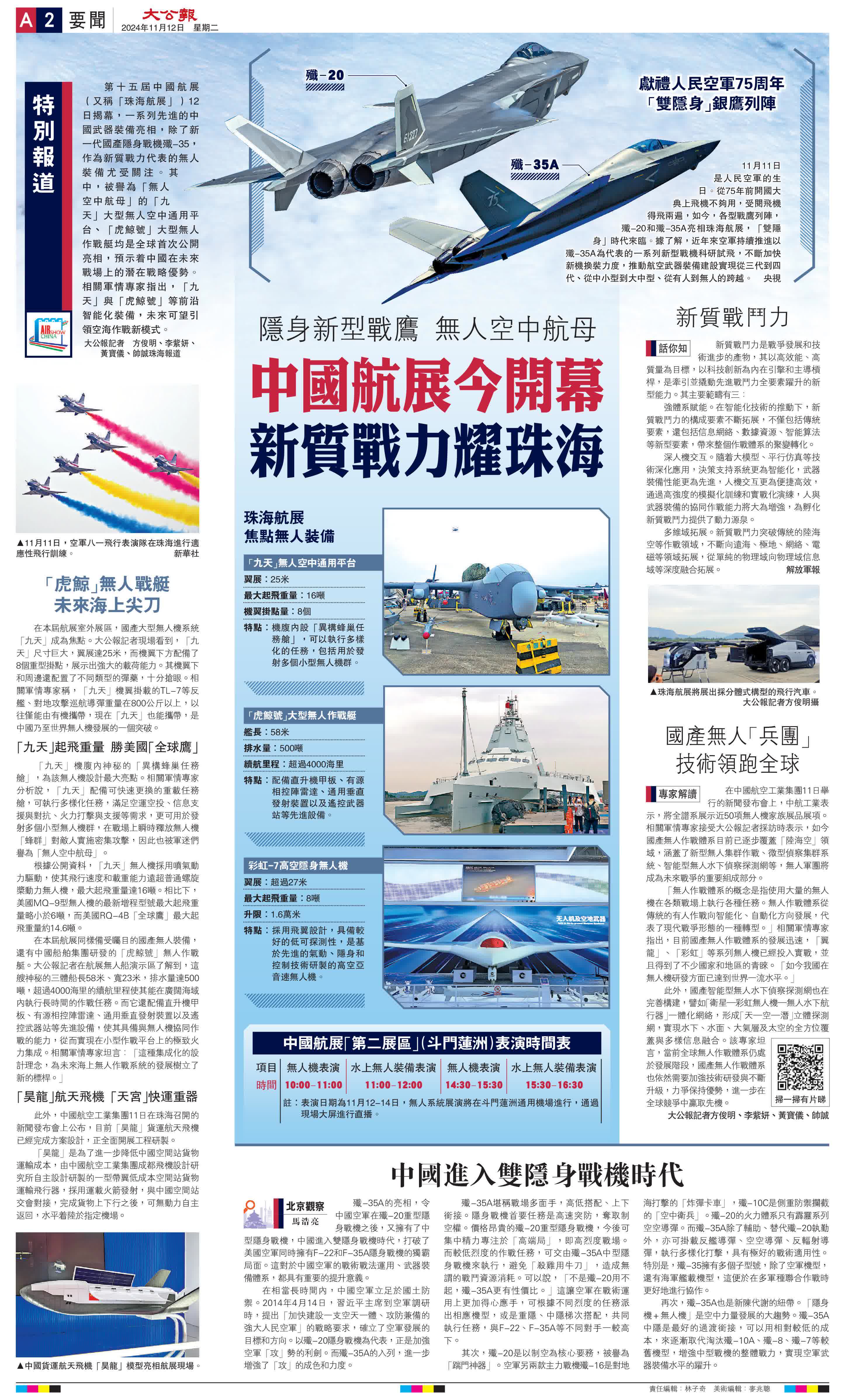 (大公報記者 方俊明、李紫妍、黃寶儀、帥誠珠海報道)第十五屆中國航展(又稱「珠海航展」)12日揭幕,一系列先進的中國武器裝備亮相,除了新一代國產隱身戰機殲-35,作為新質戰力代表的無人裝備尤受關注。其中,被譽為「無人空中航母」的「九天」大型無人空中通用平台、「虎鯨號」大型無人作戰艇均是全球首次公開亮相,預示着中國在未來戰場上的潛在戰略優勢。相關軍情專家指出,「九天」與「虎鯨號」等前沿智能化裝備,未來可望引領空海作戰新模式。