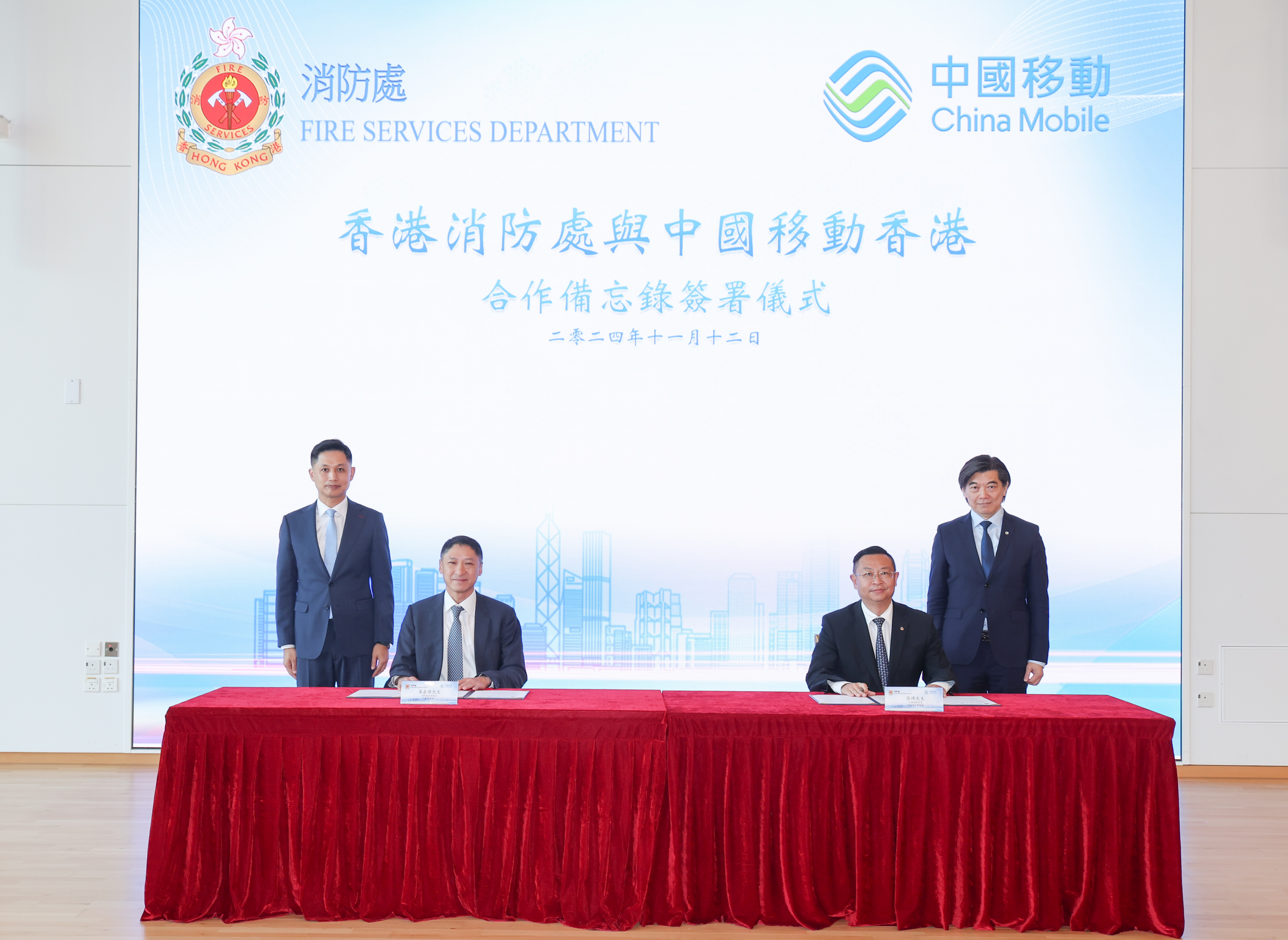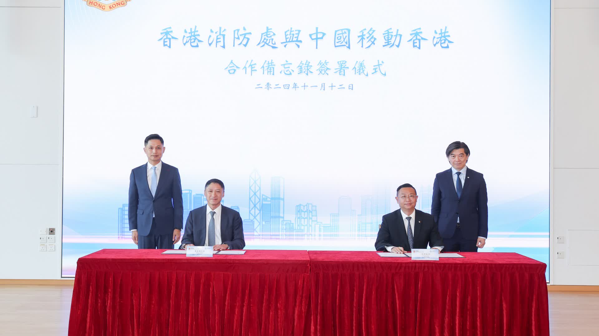 合作備忘錄由消防處助理處長(機構策略)黃嘉榮及中國移動香港政企客戶部總裁張煒簽署,並由消防處處長楊恩健及中國移動香港首席顧問李帆風見證簽署儀式。