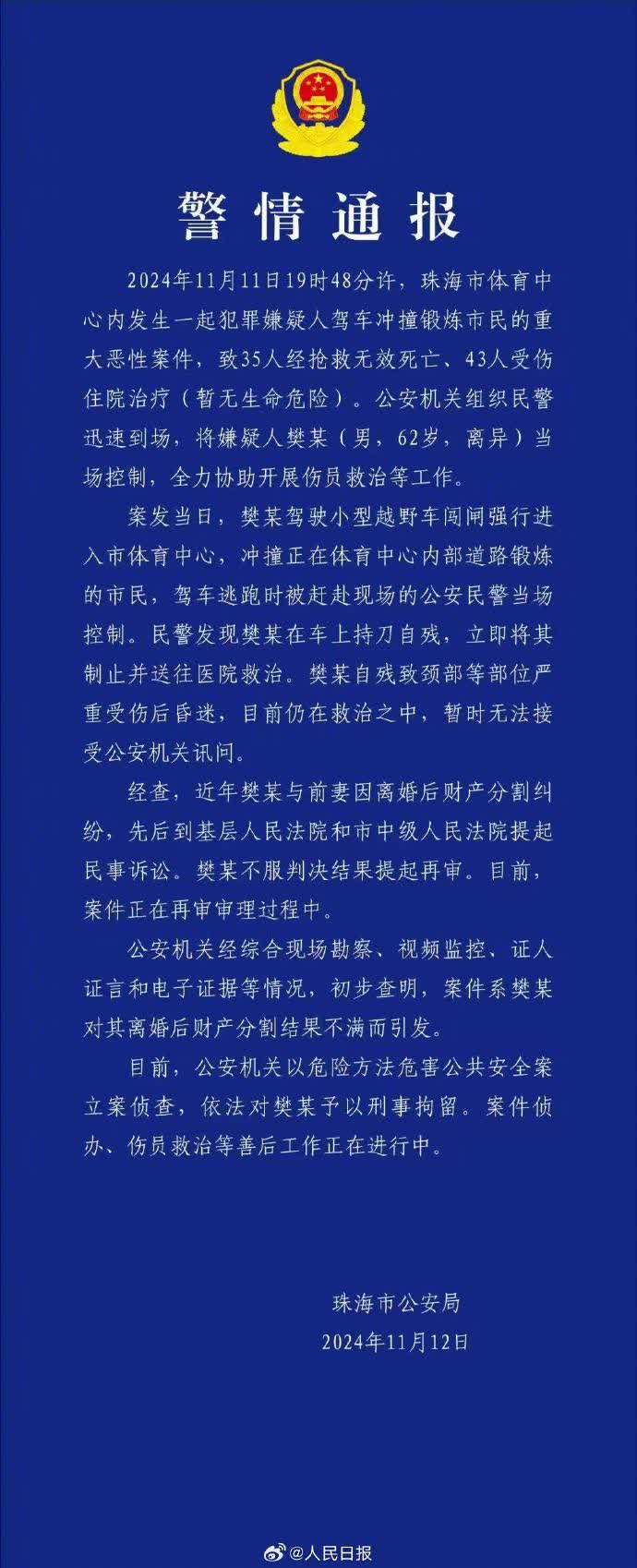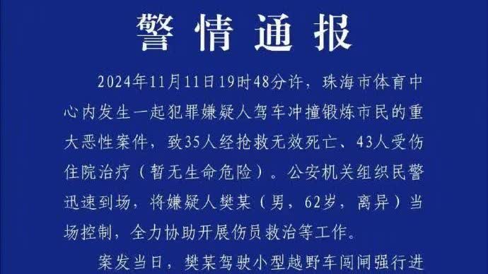 據珠海公安官方消息,2024年11月11日19時48分許,珠海發生一起駕車衝撞市民重大惡性案件。12日,珠海市公安局發布警情通報,案件致35人死亡,43人受傷。