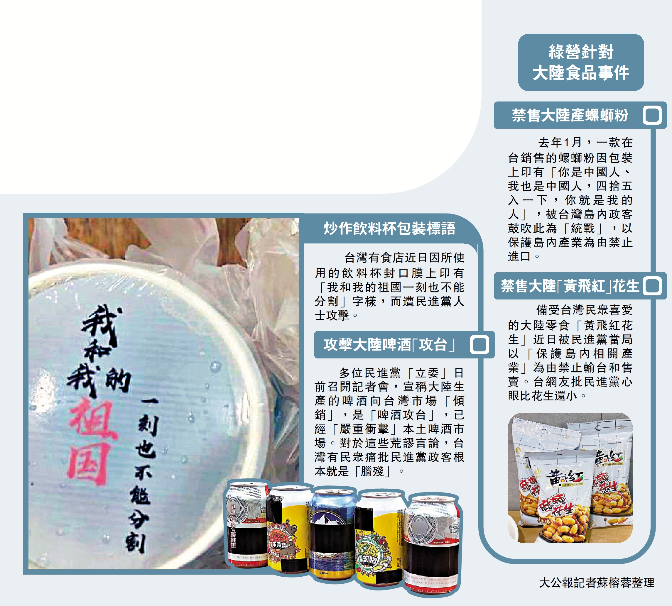 島內自由撰稿人許陳品向大公報表示,民進黨當局「逢中必反」,動輒以認知作戰為由,給大陸食品及其他商品扣上「對台統戰」的帽子,禁這禁那,限制台灣民眾選擇商品的自由。連一碗小小的螺螄粉、或一小包麻辣花生都不放過,民進黨真是走火入魔了。