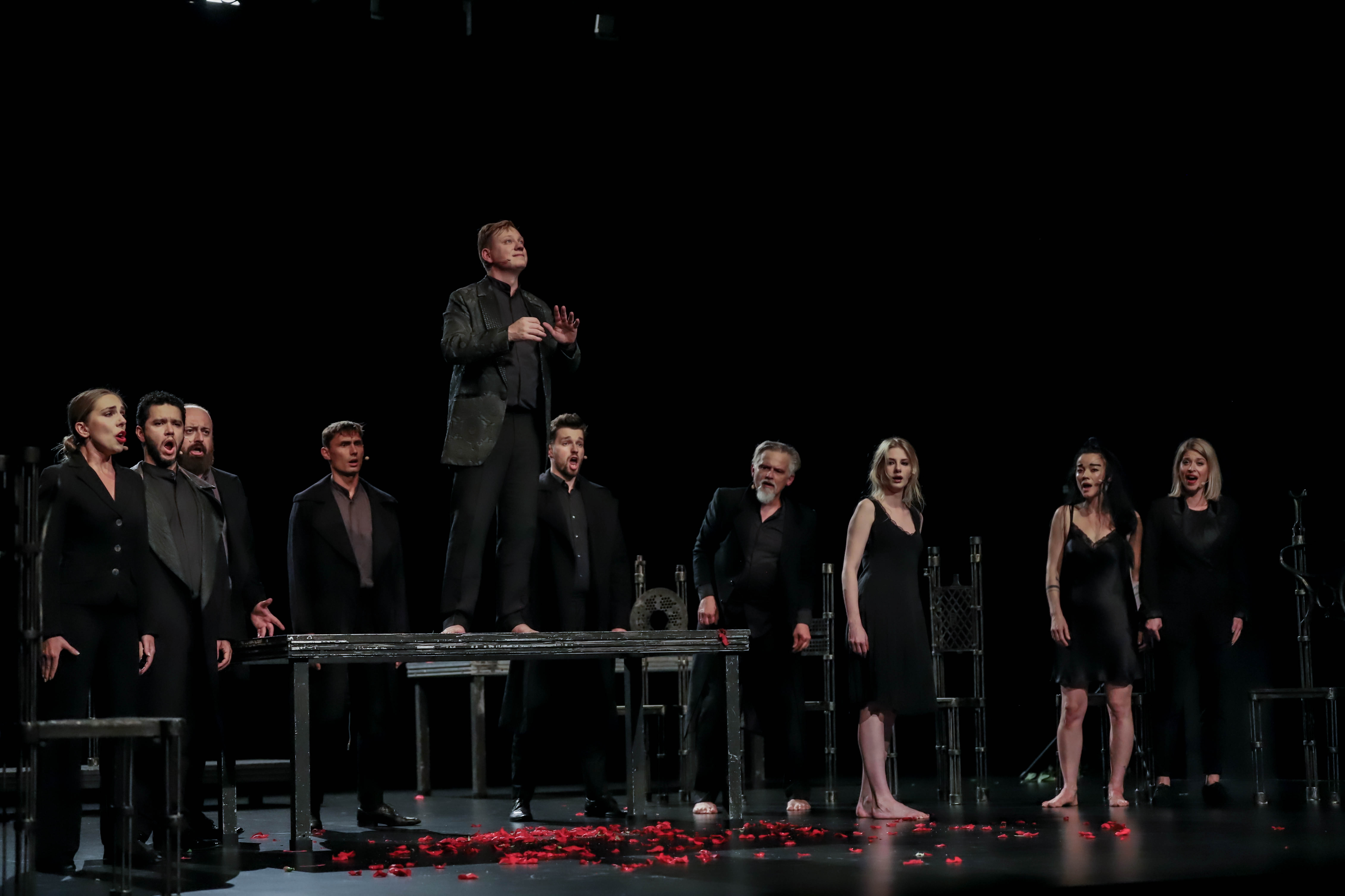 阿卡貝拉、瑞典國寶樂器、古朴歌隊、肢體語言等多位演員撇去華麗的舞台和服飾,以和充滿想像力和高超審美的敘事方式相輔相成的表演和極簡主義解構的舞台呈現方式體現了對莎士比亞戲劇精神內核的深刻演繹。這部作品,觀眾或許會有新的思考,源自古希臘的悲愴內核,融入莎士比亞的人文哲思,以聲樂、形體動作及戲劇元素,代表着劇團對古希臘悲劇傳統的繼承:對儀式感的追求,演員們肅穆莊重的表演狀態,以及對類似於古希臘劇作中「歌隊」的功能展現,都使他們的作品呈現出超然別緻的氣質,也代表着對傳統戲劇根源的回歸。