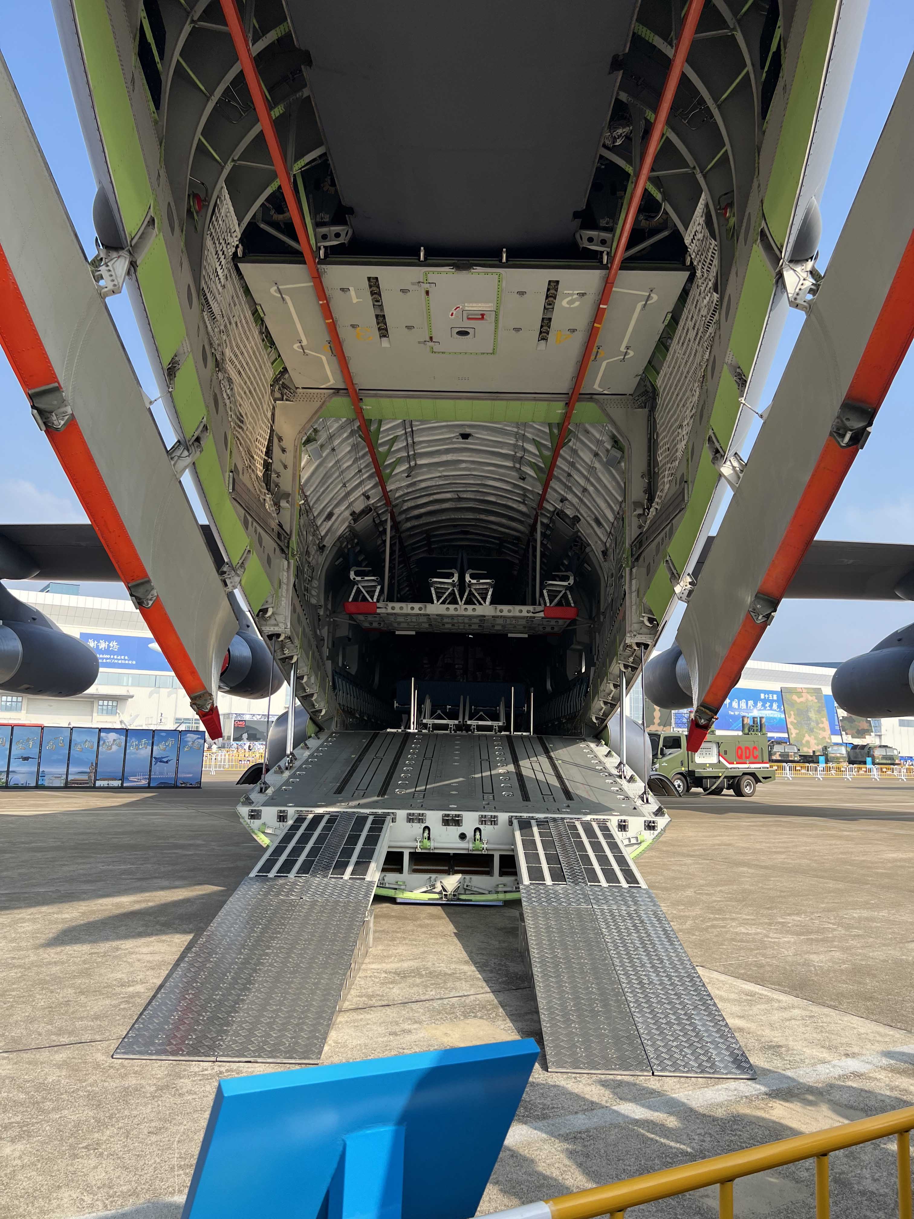 (大公文匯網 記者 方俊明、李紫妍、黃寶儀、帥誠 珠海報道)在本屆珠海航展,國產軍用大型運輸機運-20A首次展示飛機貨艙並對公眾開放預約參觀。「與「胖妞」親密接觸的機會很難得!」有觀眾參觀後表示,相比一般貨運飛機的逼仄感,運-20A內艙感覺十分整潔明亮;最讓人驚喜的是,在執行人員運輸任務時,還能「秒變」雙層。
