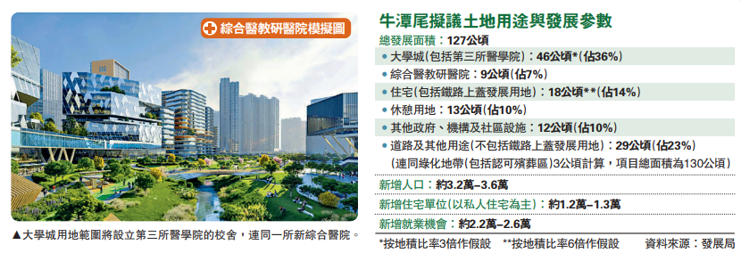 (大公報記者 王亞毛、鄭文迪、郭如佳)政府持續推出北部都會區發展細節,昨日公布牛潭尾的初步規劃建議,總發展面積約127公頃,當中46公頃將發展大學城,包括本港第三所醫學院,另預留9公頃土地興建一所綜合醫院,除提供醫療服務外,亦會發展為一所醫教研三重功能的教研設施。港鐵北環綫牛潭尾站附近和大學城內將興建公共運輸交匯處,為居民、醫護、學生等提供公共交通及轉乘接駁服務。