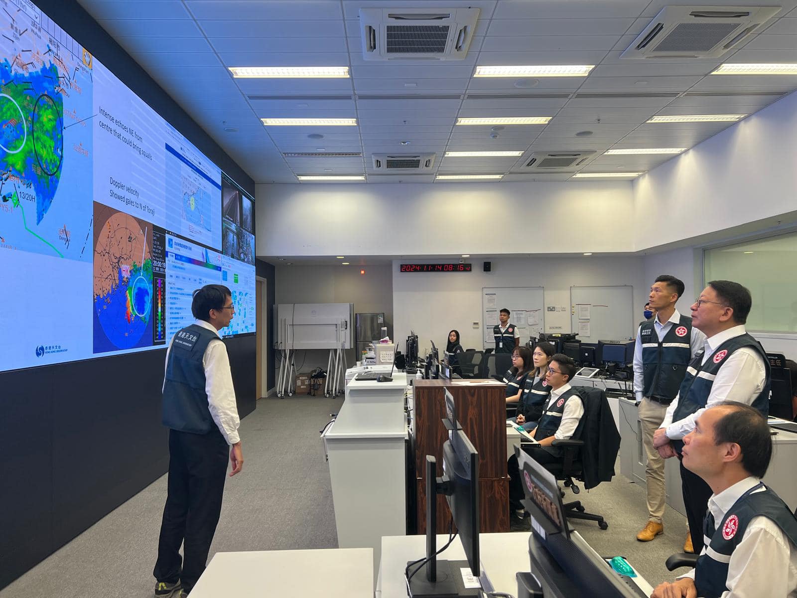 今天早上,陳國基到緊急事故監察及支援中心視察,聽取有關「桃芝」最新情況的匯報,以及中心的統籌部署和應急協調工作。風暴襲港期間,中心一直持續密切監察全港各區的情況。陳國基了解到風暴期間市面秩序大致良好,只有零星塌樹報告,相關政府部門已快速應變處理,守護市民的生命財產安全。