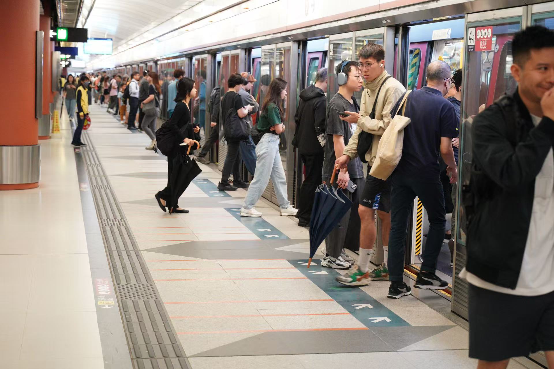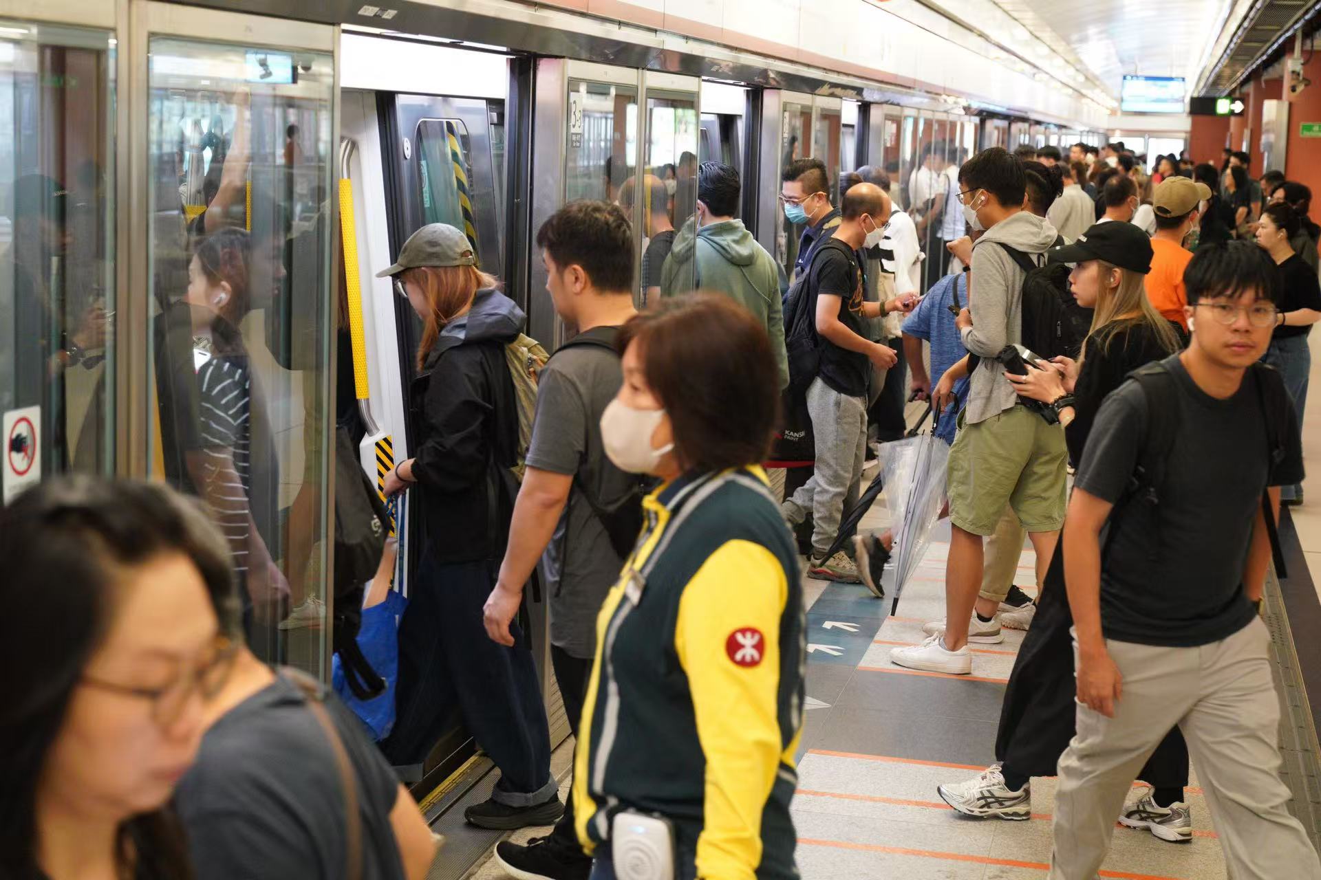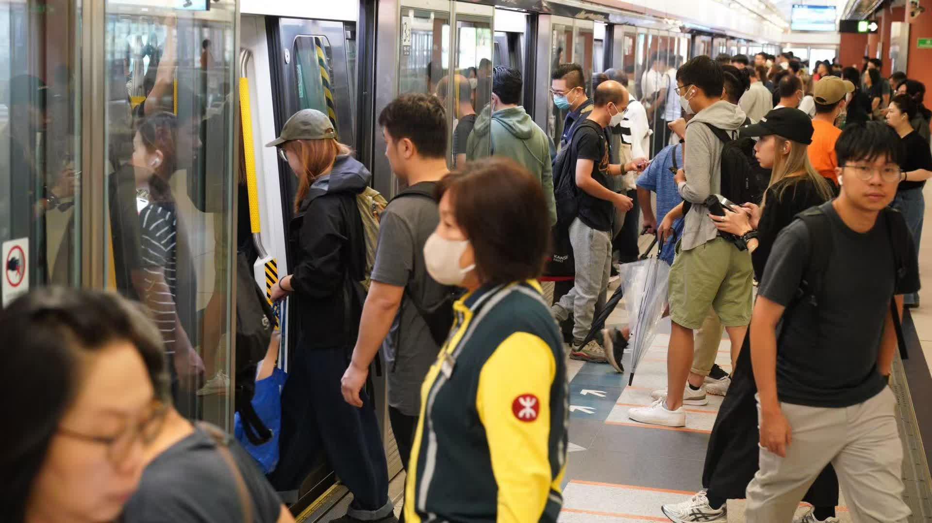 大公文匯全媒體報道,熱帶風暴「桃芝」減弱並開始遠離本港,天文台今早(14日)10時20分改發3號風球,一眾打工仔陸續返工。記者在地鐵站見到,港鐵已逐步加密班次恢復服務,不少打工仔腳步匆匆急返工,地鐵站內人潮擁擠人流量大。