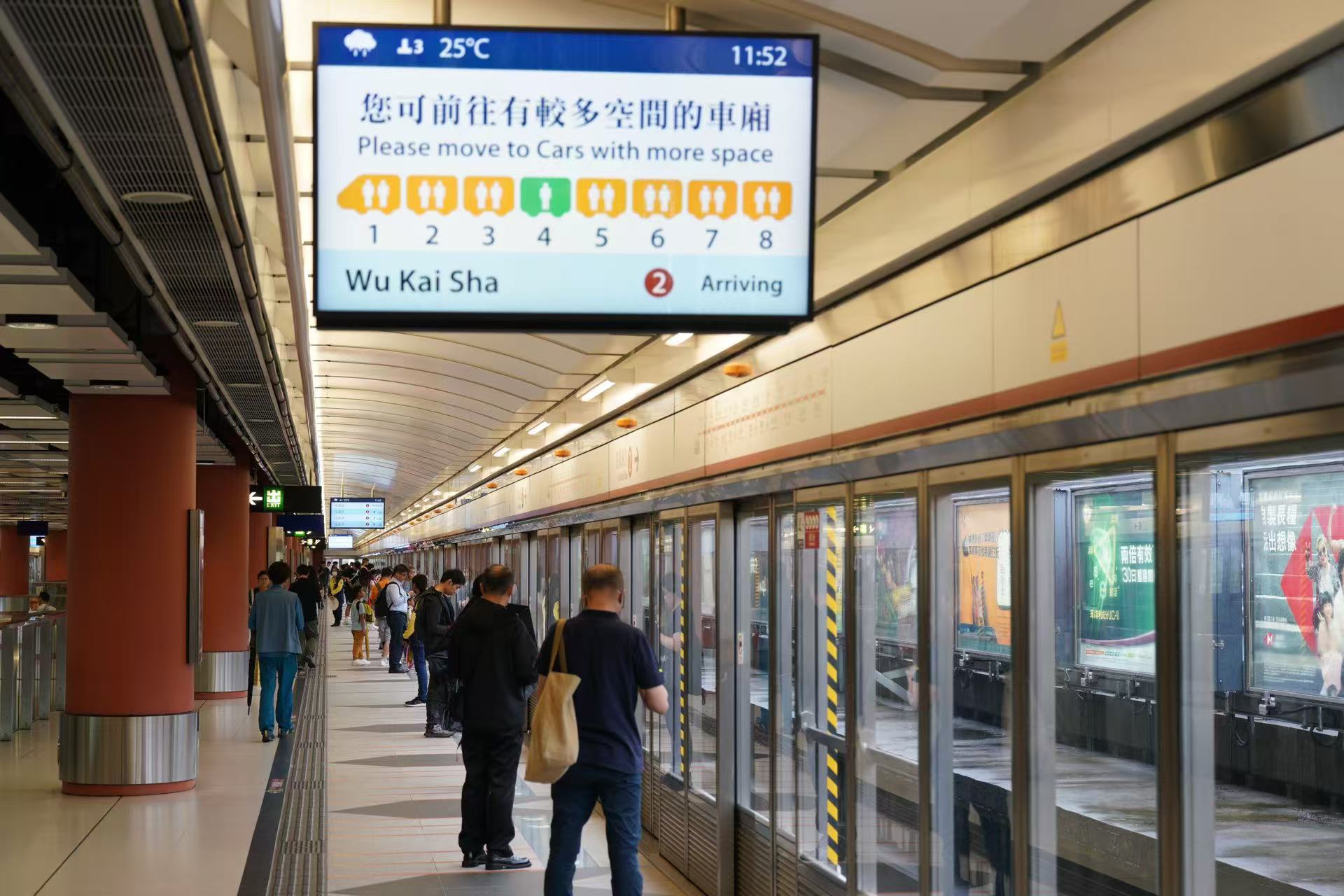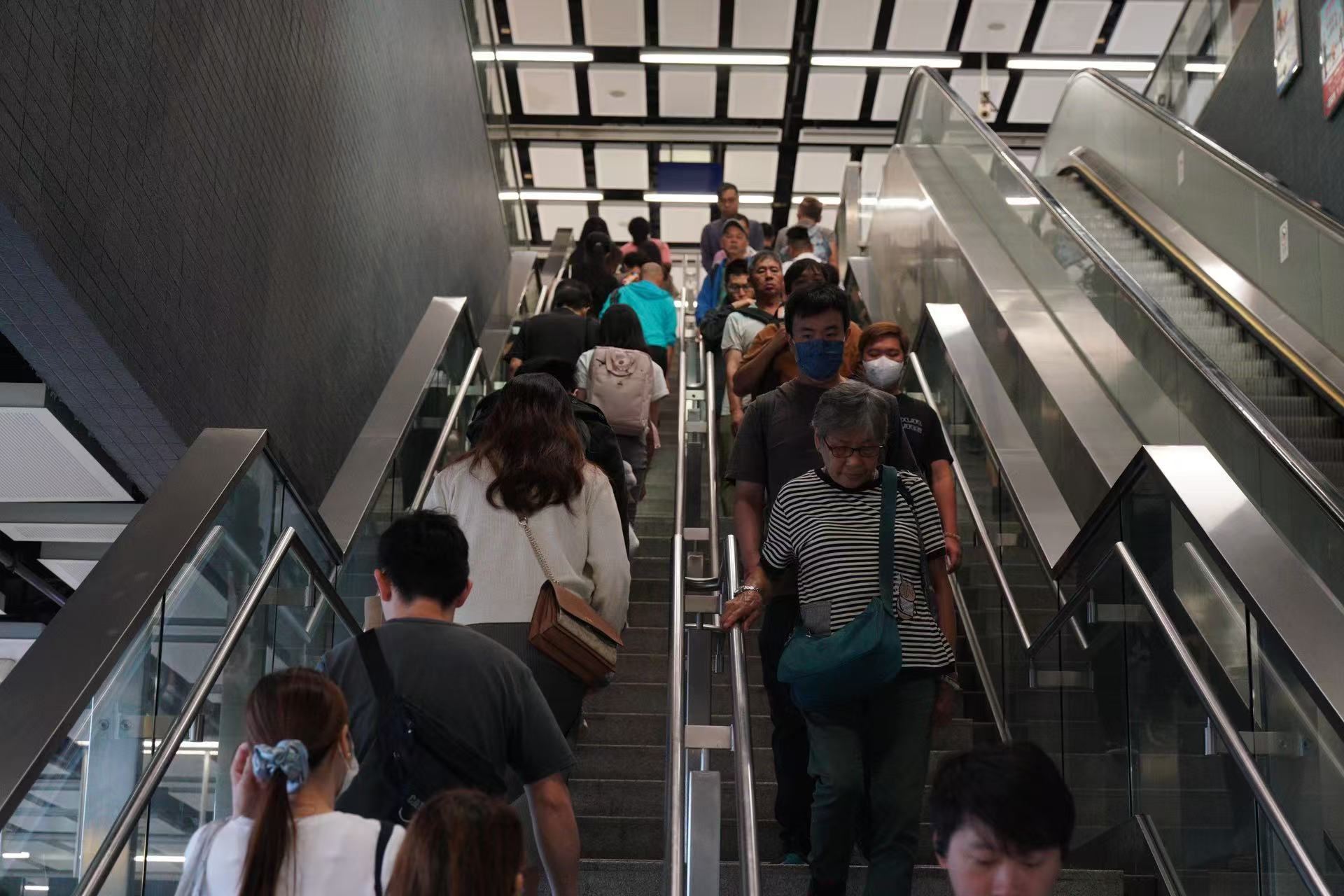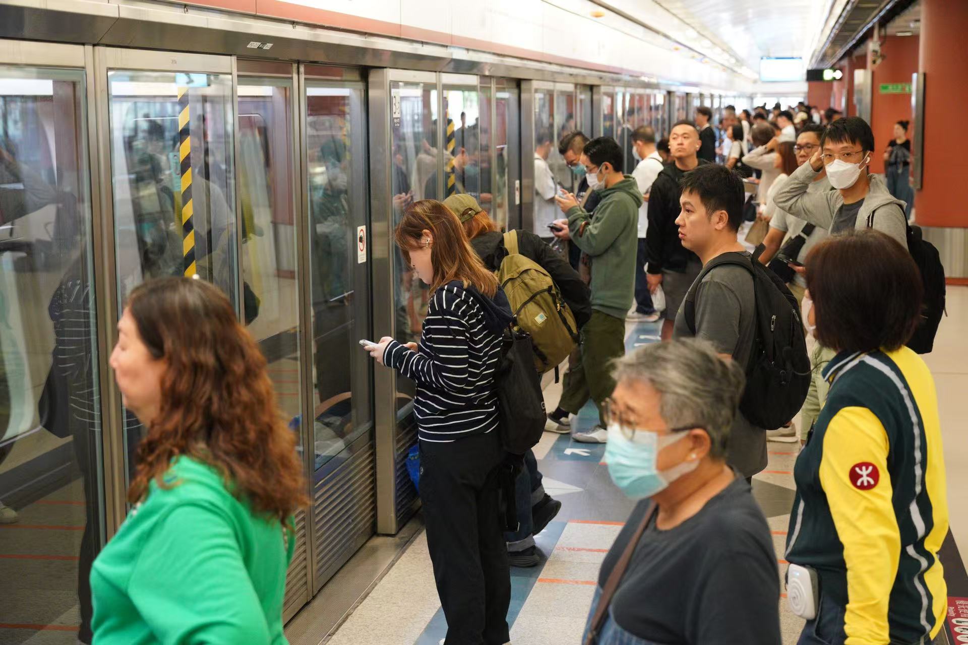 大公文匯全媒體報道,熱帶風暴「桃芝」減弱並開始遠離本港,天文台今早(14日)10時20分改發3號風球,一眾打工仔陸續返工。記者在地鐵站見到,港鐵已逐步加密班次恢復服務,不少打工仔腳步匆匆急返工,地鐵站內人潮擁擠人流量大。