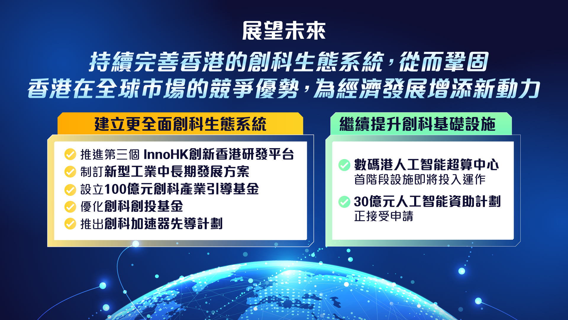 政府將持續完善創科生態系統,提升創科基礎設施,鞏固香港在全球市場的競爭優勢,為經濟發展增添新動力。