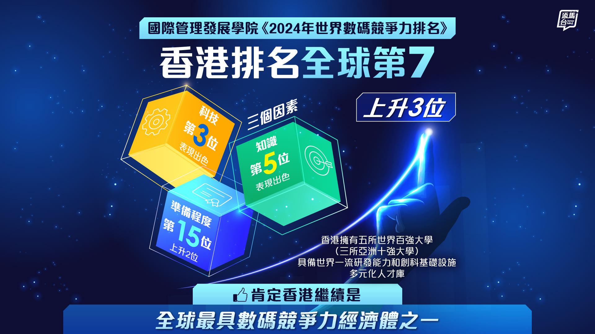 國際管理發展學院最新發布《2024年世界數碼競爭力排名》,香港排名上升3位至全球第7,肯定香港繼續是全球最具數碼競爭力的經濟體之一。