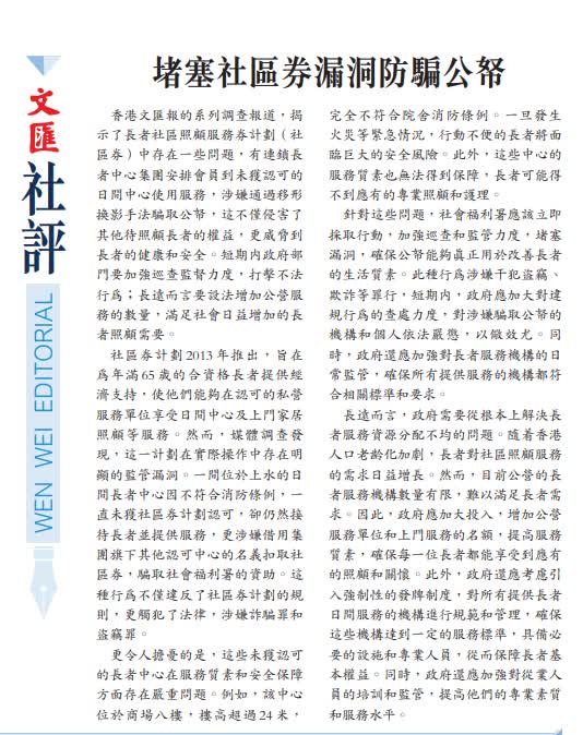 香港文匯報的系列調查報道,揭示了長者社區照顧服務券計劃(社區券)中存在一些問題,有連鎖長者中心集團安排會員到未獲認可的日間中心使用服務,涉嫌通過移形換影手法騙取公帑,這不僅侵害了其他待照顧長者的權益,更威脅到長者的健康和安全。短期內政府部門要加強巡查監督力度,打擊不法行為;長遠而言要設法增加公營服務的數量,滿足社會日益增加的長者照顧需要。