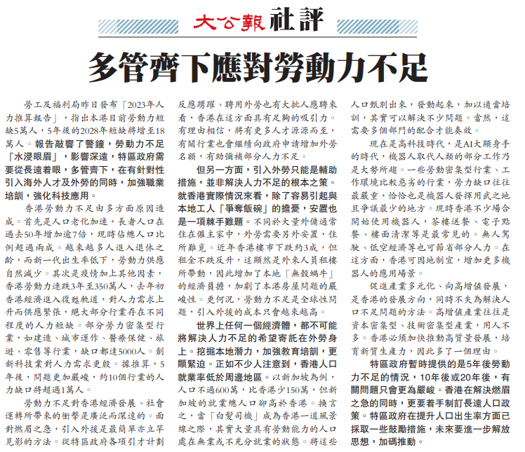世界上任何一個經濟體,都不可能將解決人力不足的希望寄託在外勞身上。挖掘本地潛力,加強教育培訓,更顯緊迫。正如不少人注意到,香港人口就業率低於周邊地區。以新加坡為例,人口不過600萬,比香港少150萬,但新加坡的就業總人口卻高於香港。換言之,當「白髮司機」成為香港一道風景線之際,其實大量具有勞動能力的人口處在無業或不充分就業的狀態。將這些人口甄別出來,發動起來,加以適當培訓,其實可以解決不少問題。當然,這需要多個部門的配合才能奏效。