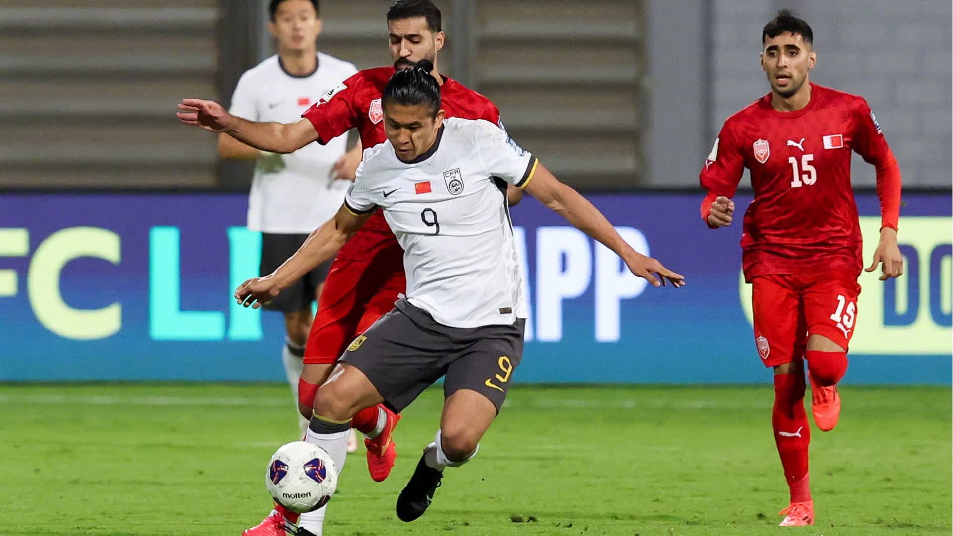 上半場第11分鐘,朱辰傑送出長傳,張玉寧獲得絕佳單刀機會,但推射遠角被對方門將撲出!第16分鐘,巴林隊左路傳中,阿卜杜勒·賈巴爾包抄沒能碰到皮球,王大雷門前解圍撲空失誤,李磊後點奮力救火將球封堵出底線!此後李磊傷退,胡菏韜替補登場。隨後雙方都無法打破場上僵局,半場結束,比分為0-0。