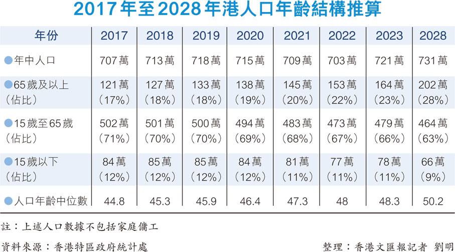 孫玉菡表示,目前最大的挑戰是人口老化,去年65歲以上人口佔整體23%,至2028年相關人口淨增長38萬人,佔總人口28%,人口年齡中位數亦由去年的48.3歲增至50.2歲,熟練技術人員和非技術人員現時年齡中位數分別達50歲及53歲,在人手緊絀下估計會延遲退休,但仍難以長遠維持,相信勞動人口始終會出現「斷崖式」下降。