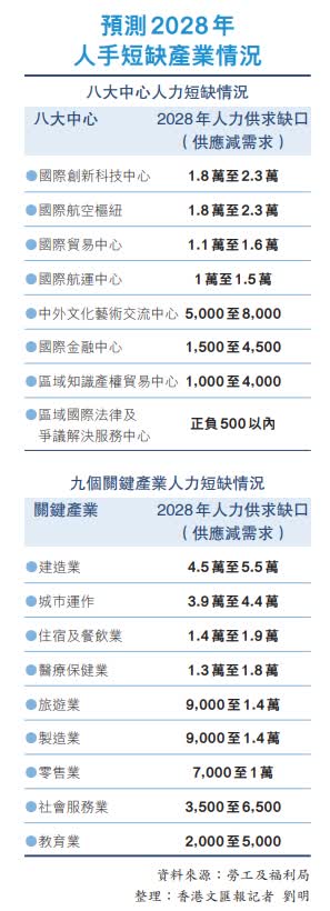 「八大中心」所需人力也出現缺口,當中國際創新科技中心2028年的人力需求較去年增長六成,需要9.64萬人,國際航空樞紐人力需求增加45%,要8.99萬人,但人力短缺1.8萬至2.3萬人,國際貿易中心和國際航運中心人力缺口亦超過1萬人。