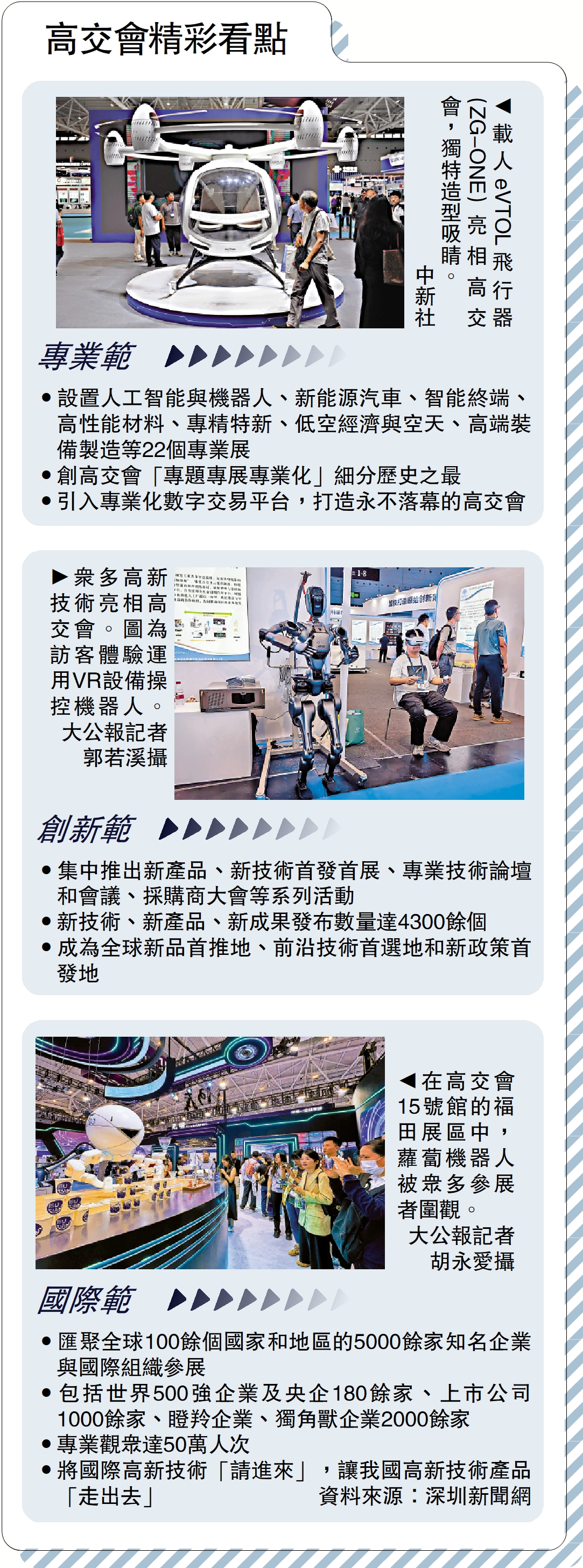 (大公報記者 石華、李薇深圳報道)11月14日,為期三天的第二十六屆中國國際高新技術成果交易會(高交會)在深圳國際會展中心盛大開幕,來自全球100餘個國家和地區的5000餘家知名企業與國際組織參展參會。其中,香港館以獨特的創新生態和前沿科技產品成為本次展會的矚目焦點。