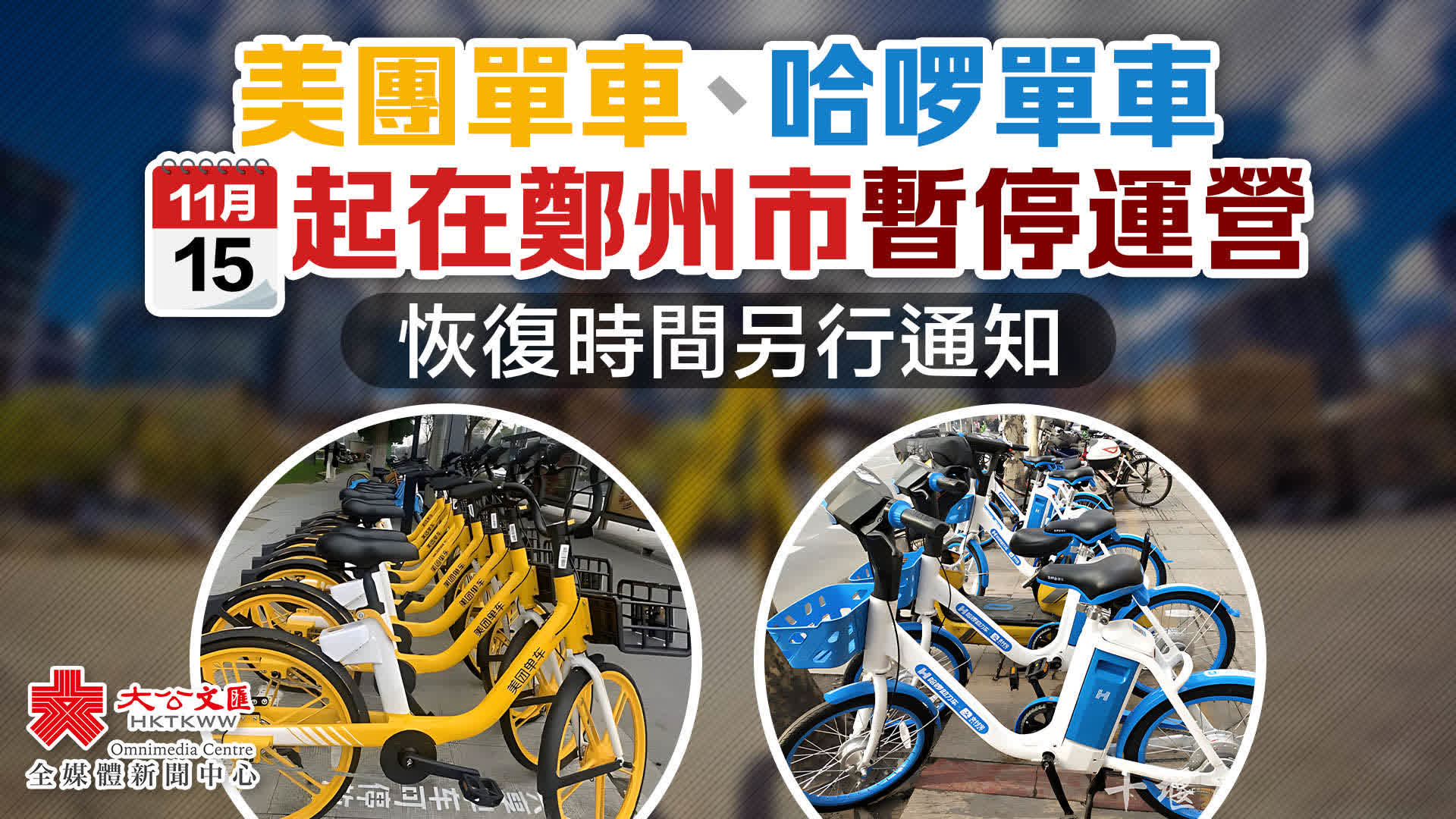 (大公文匯網記者 劉蕊 河南報道)11月15日,從美團單車客服處了解到,因車輛回倉保養,美團單車將於2024年11月15日10:00在鄭州市暫停運營,恢復時間另行通知。哈啰單車客服回應確認,因系統全面升級,哈啰單車將於2024年11月15日起在鄭州市暫停運營,恢復時間另行通知。
