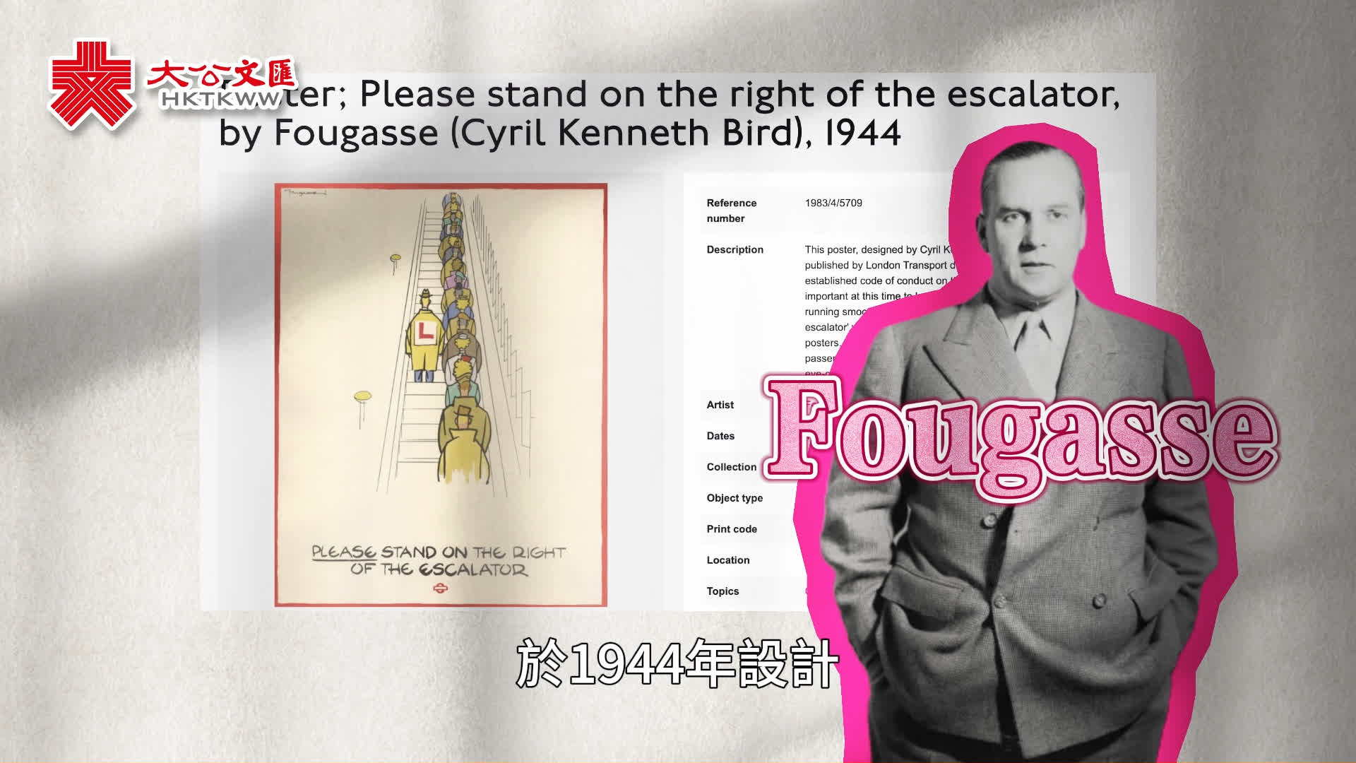 「左行右立」的觀念最早來源於二戰時期的倫敦地鐵。當時,車站設施與工作人員短缺,流動人員卻不斷增長,應倫敦交通局(London Transport)的希望,一系列傳播地鐵禮儀規則的公共資訊海報、標語應運而生,它們也同時推動了交通效率的提升。這張海報《Please stand on the right of the escalator》(請站在扶手電梯的右邊),便是其中之一,它由著名英國漫畫家Fougasse於1944年設計。