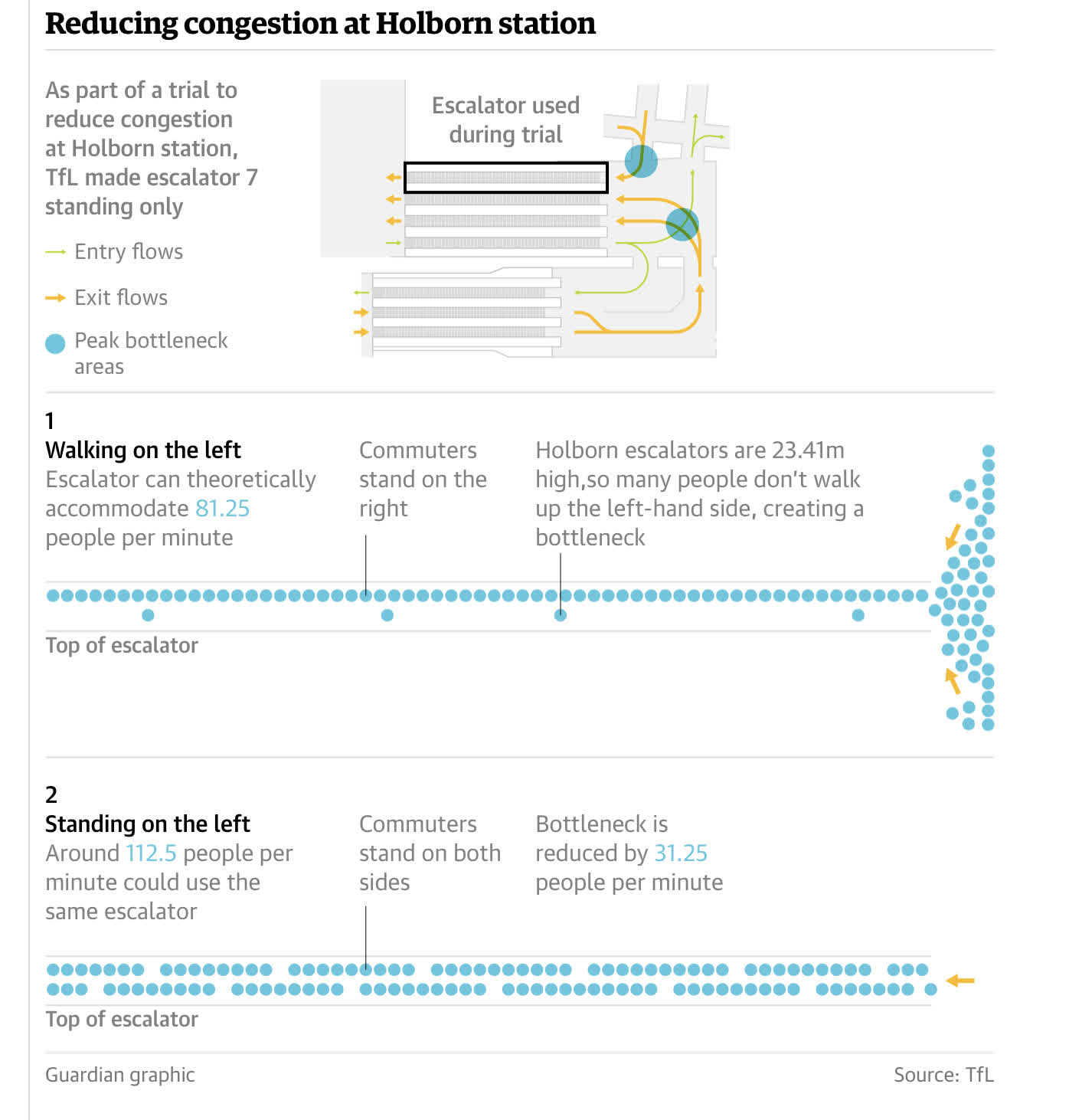 最後是效率問題,根據《衛報》(The Guardian)的報道,大部分乘客只站扶梯一側,扶梯負載量減半,反而造成底部塞滿更多人,拖慢了大家的速度。