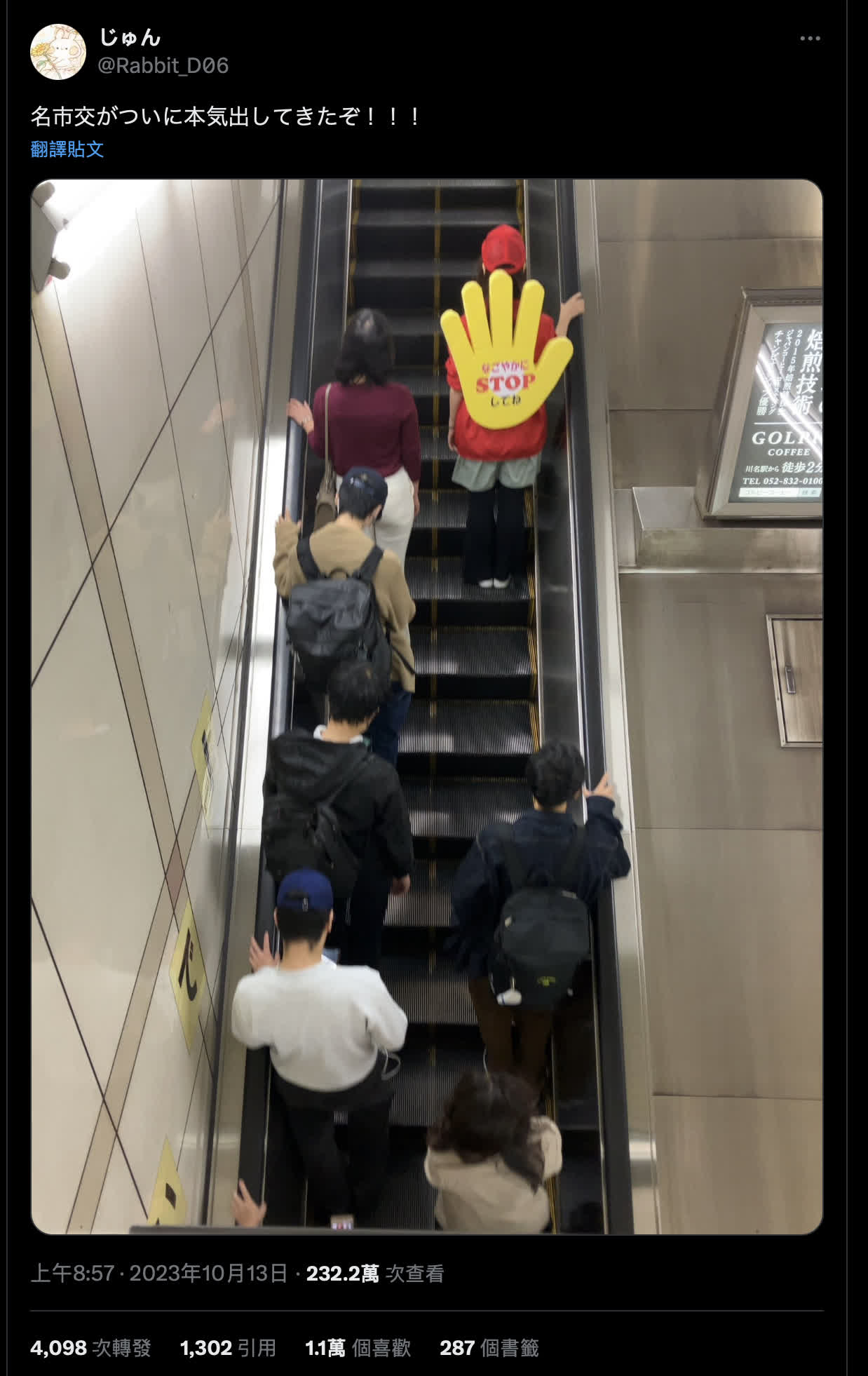 因此,「左右站定」「站穩扶好」在世界各地已明確取代了「左行右立」,例如,日本名古屋交通局甚至讓工作人員背着黃色手掌「STOP」的標牌,站在扶梯上。但是,要改變曾經根深蒂固的「文明理念」仍是道阻且長。