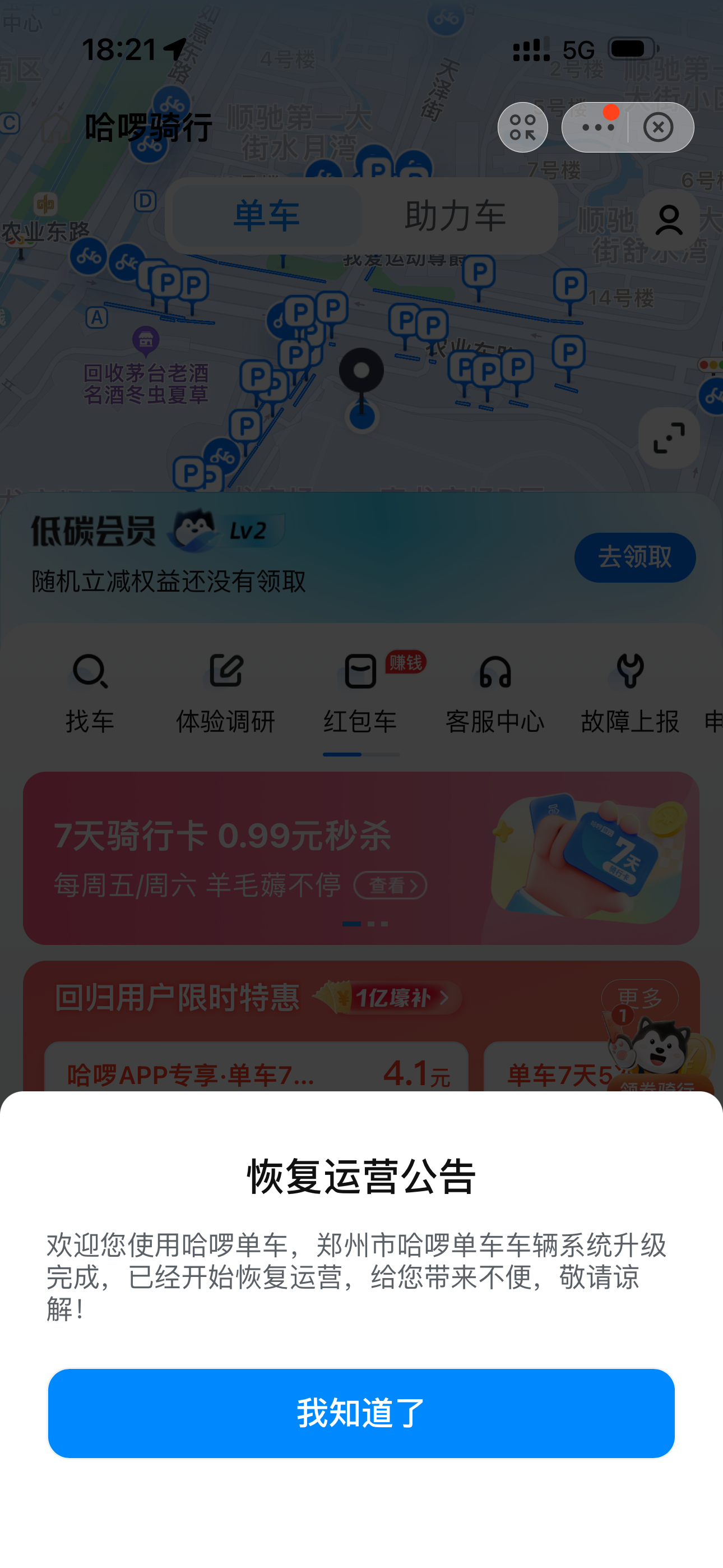 公告稱:「歡迎您使用哈啰單車,鄭州市哈啰單車車輛系統升級完成,已經開始恢復運營,給您帶來不便,敬請諒解。」