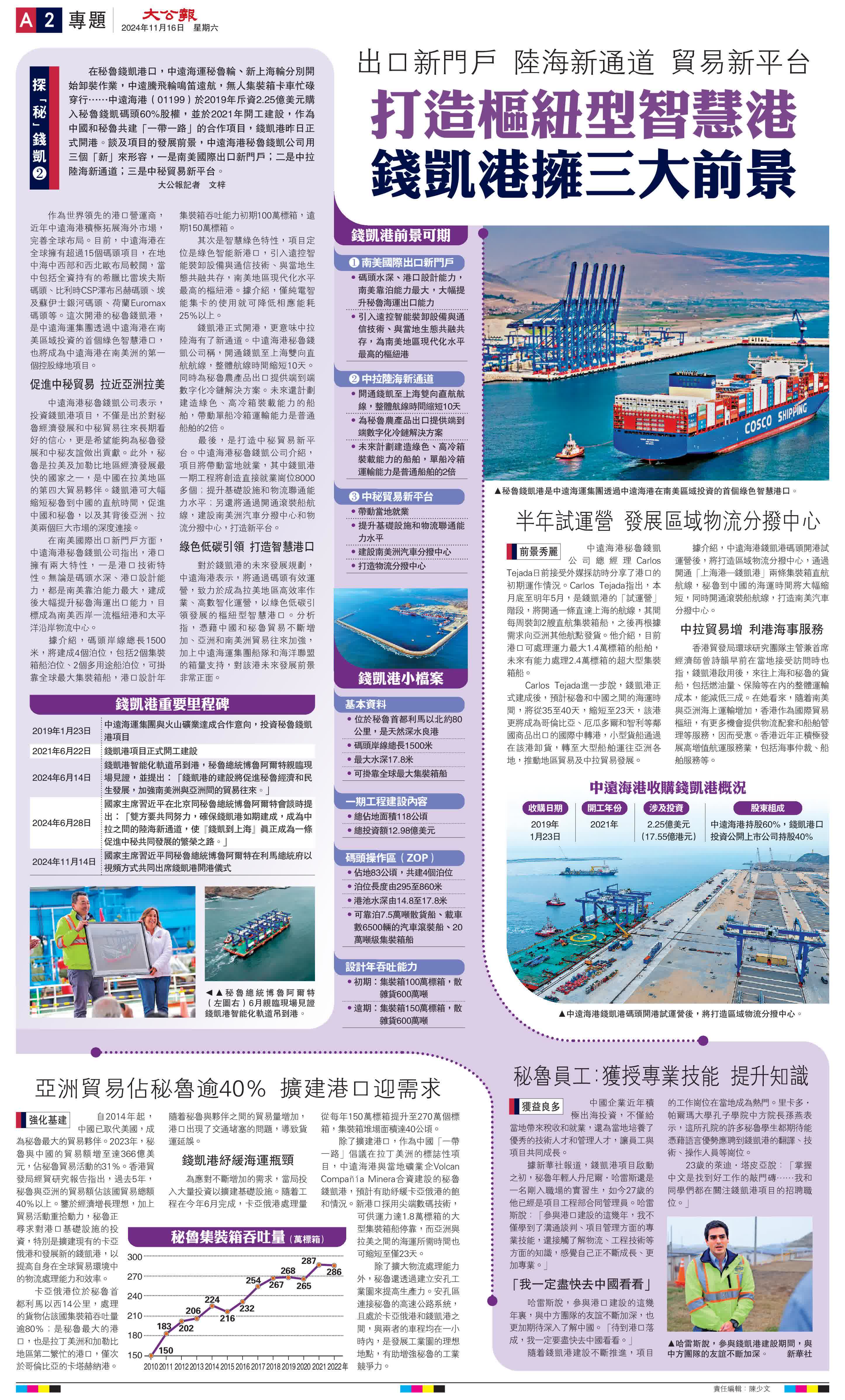 (大公報記者 文梓)在秘魯錢凱港口,中遠海運秘魯輪、新上海輪分別開始卸裝作業,中遠騰飛輪鳴笛遠航,無人集裝箱卡車忙碌穿行……中遠海港(01199)於2019年斥資2.25億美元購入秘魯錢凱碼頭60%股權,並於2021年開工建設,作為中國和秘魯共建「一帶一路」的合作項目,錢凱港昨日正式開港。談及項目的發展前景,中遠海港秘魯錢凱公司用三個「新」來形容,一是南美國際出口新門戶;二是中拉陸海新通道;三是中秘貿易新平台。