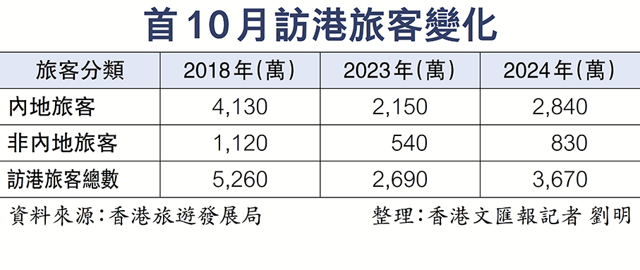 旅發局又公布了上月初步訪港旅客統計數字為410萬人次,較去年同期升18%;首10個月錄得近3,670萬訪港旅客人次,相較疫情前的2018年5,260萬人次,暫只回復約七成水平。